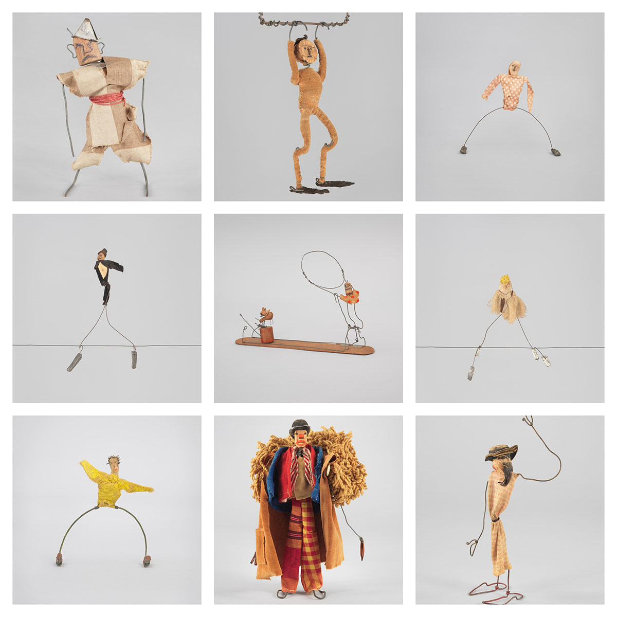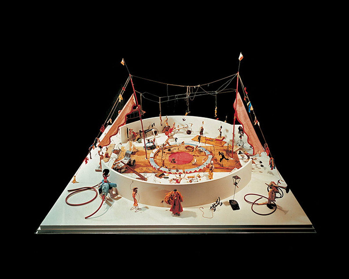 Calder began building Circus while living in Paris in 1926, using wire, fabric, cork, wood, string, and found objects to create a cast of acrobats, animals, clowns, a sword swallower, and a ringmaster. He animated these figures in live performances that could last up to two hours, complete with music, lighting, and his own narration. Audiences included fellow artists such as Marcel Duchamp, Joan Miró, Piet Mondrian, and Isamu Noguchi.
