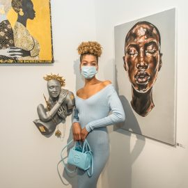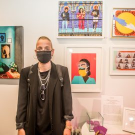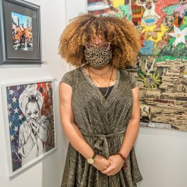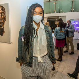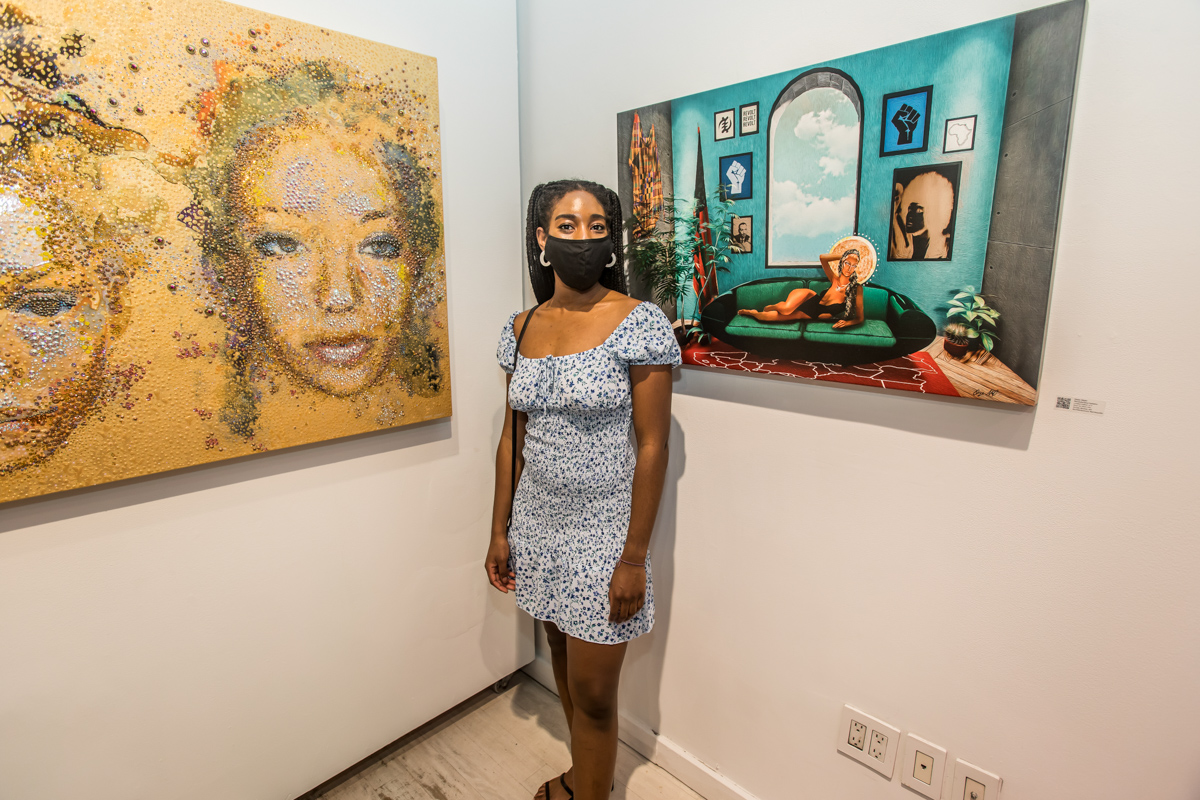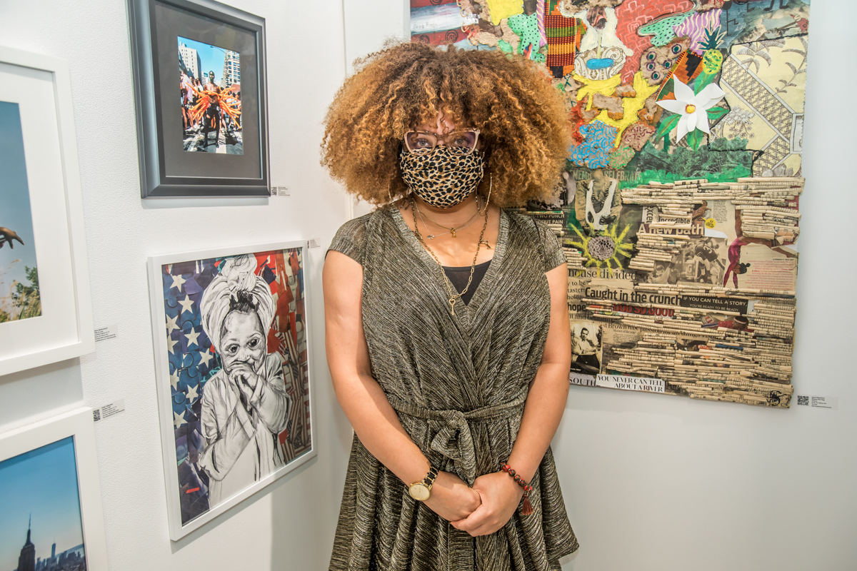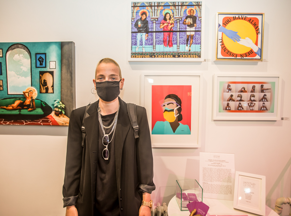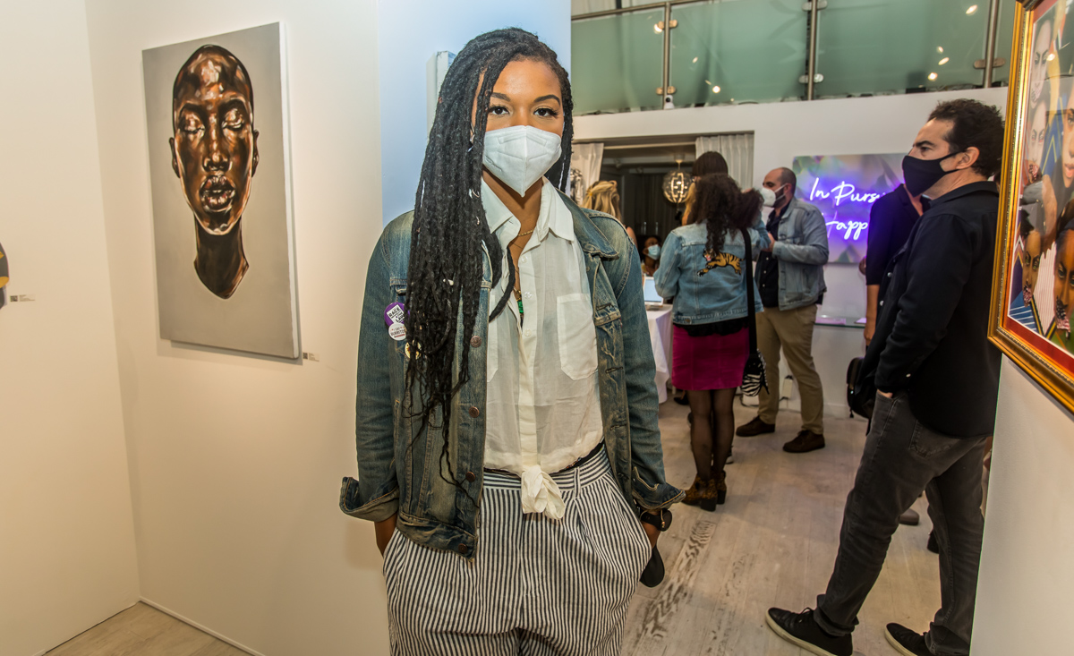 Artist Devynity Wray at the "Art4Equality x Life, Liberty, The Pursuit of Happiness" Exhibition Opening Reception at The Untitled Space, presented in collaboration with SaveArtSpace and Art4Equality