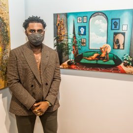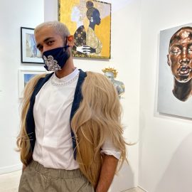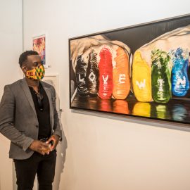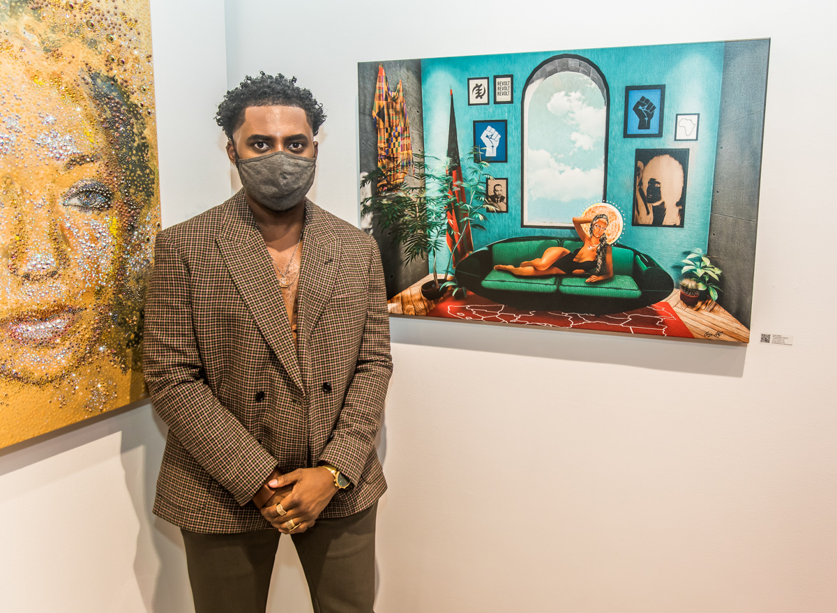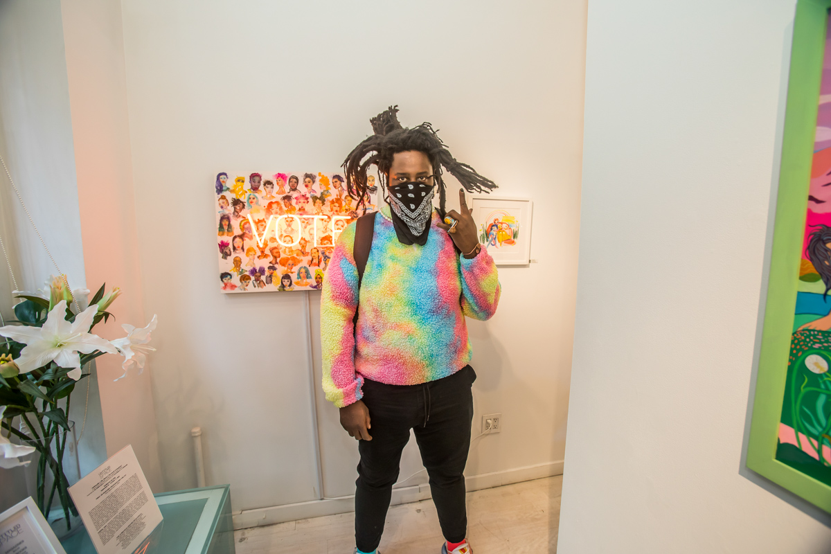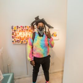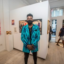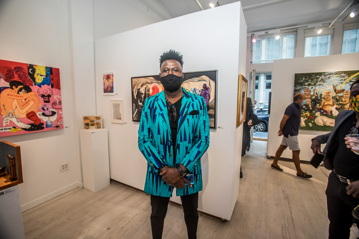 Artist Osaze Stigler at the "Art4Equality x Life, Liberty, The Pursuit of Happiness" Exhibition Opening Reception at The Untitled Space, presented in collaboration with SaveArtSpace and Art4Equality