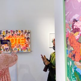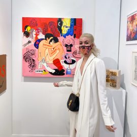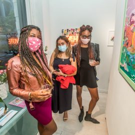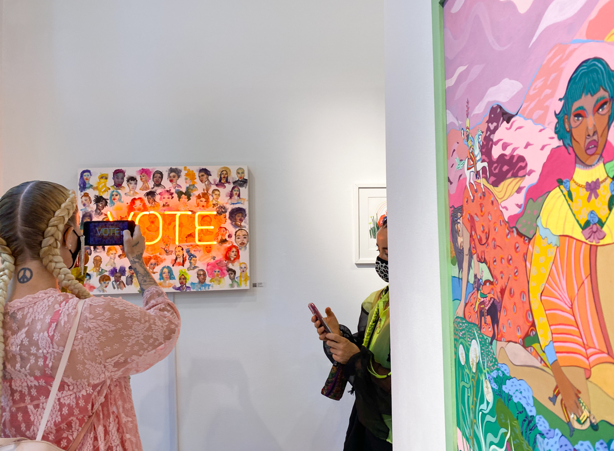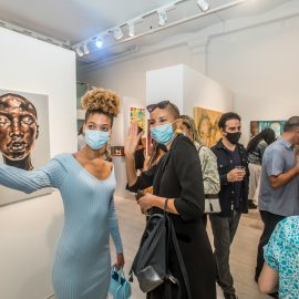 On September 26th, The Untitled Space gallery in Tribeca, NY celebrated the opening of group exhibition and public art series “Art4Equality x Life, Liberty & The Pursuit of Happiness”presented in collaboration with SaveArtSpace and Art4Equality. The two-part exhibit, which features over 50 artists, is the first new exhibition presented by the gallery since the COVID closures. The reception for the group show was presented as an all day long affair, from 1pm – 8pm, with The Untitled Space founder, artist Indira Cesarine, as well as many of the exhibiting artists in attendance including Ashley Chew, Osaze Stigler, Leah Schrager, Alexandra Rubinstein, Annika Connor, Coco Dolle, D’nae Harrison, Kim McCarty, Rachel Van Der Nacht, Travis Rueckert, and Tslil Tsemet, among many others. The energy was uplifting as mask-wearing guests enjoyed the return to in-person exhibitions and celebrated the gallery’s 1st exhibition featuring not only a gallery show but also public art series, with 10 of the artworks featured on billboards throughout New York City.