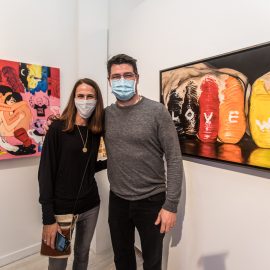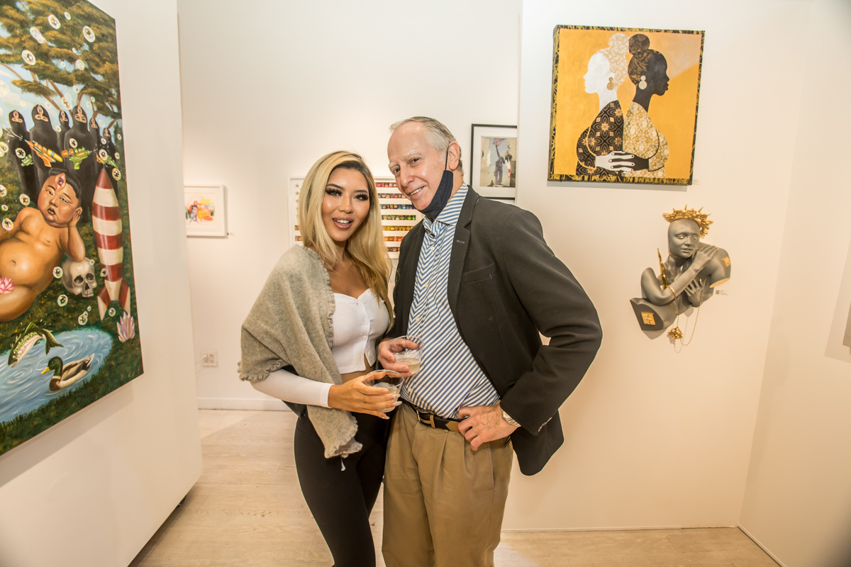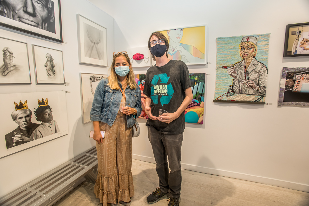 Artist Travis Rueckert with Robyn Rueckert at the "Art4Equality x Life, Liberty, The Pursuit of Happiness" Exhibition Opening Reception at The Untitled Space, presented in collaboration with SaveArtSpace and Art4Equality