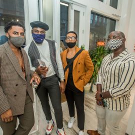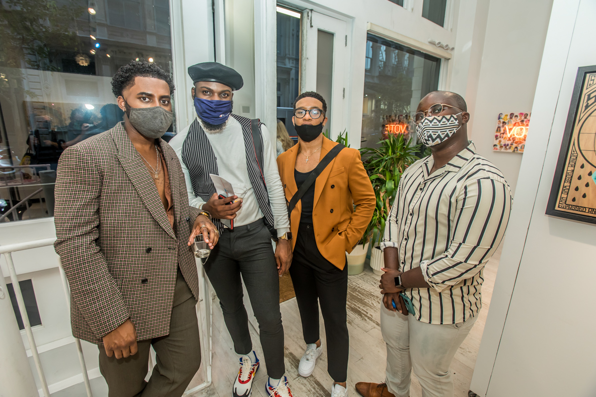 Artist Osaze Stigler and guests Agbai Kalu, Vincent McNatt, Larry Ossei-Mensan at the "Art4Equality x Life, Liberty, The Pursuit of Happiness" Exhibition Opening Reception at The Untitled Space, presented in collaboration with SaveArtSpace and Art4Equality