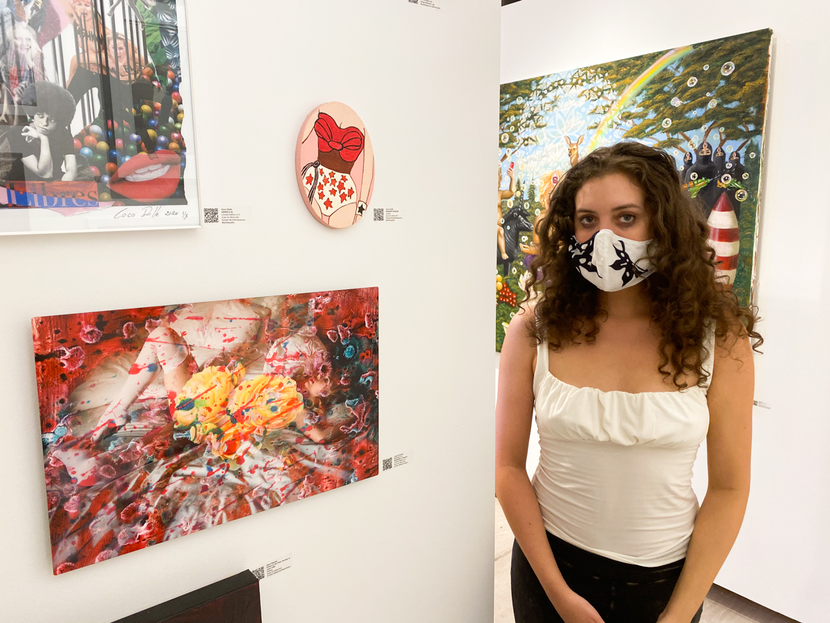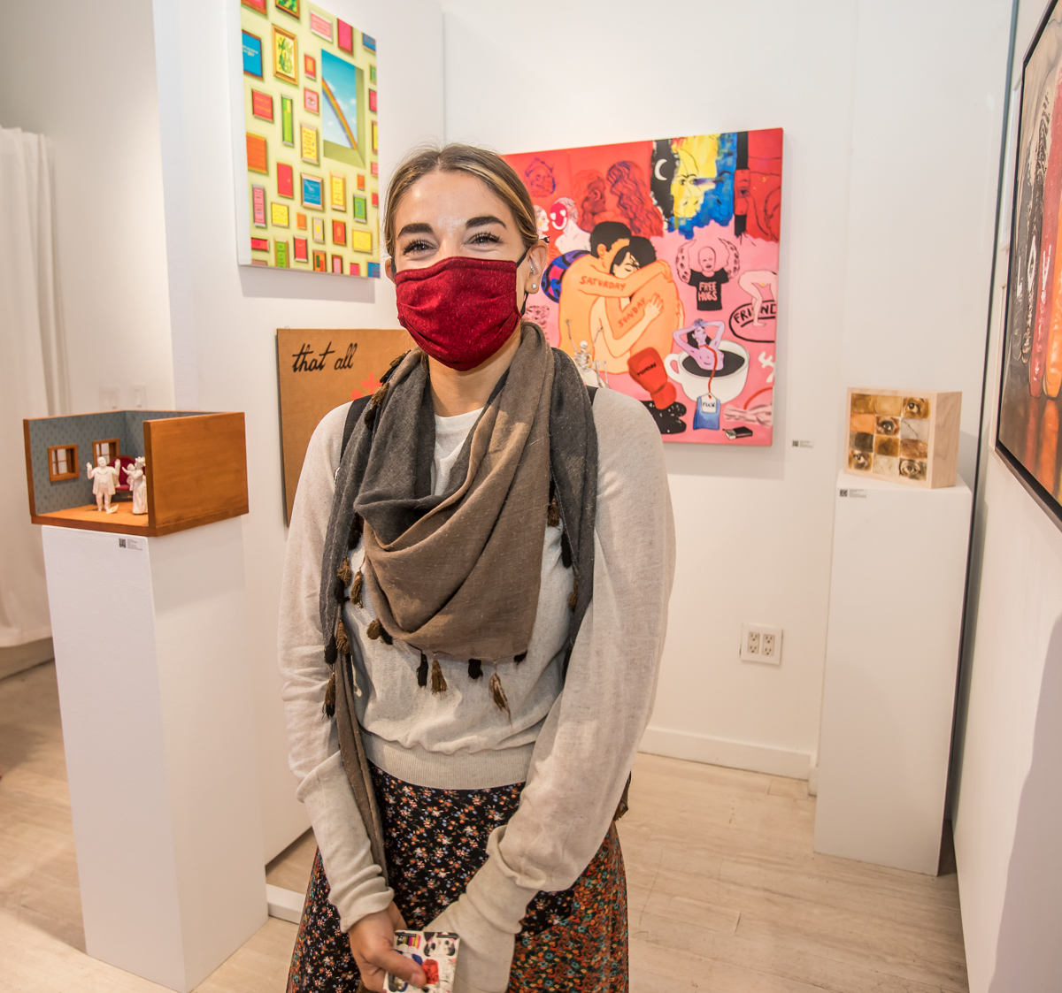 Artist Leah Schrager at the "Art4Equality x Life, Liberty, The Pursuit of Happiness" Exhibition Opening Reception at The Untitled Space, presented in collaboration with SaveArtSpace and Art4Equality