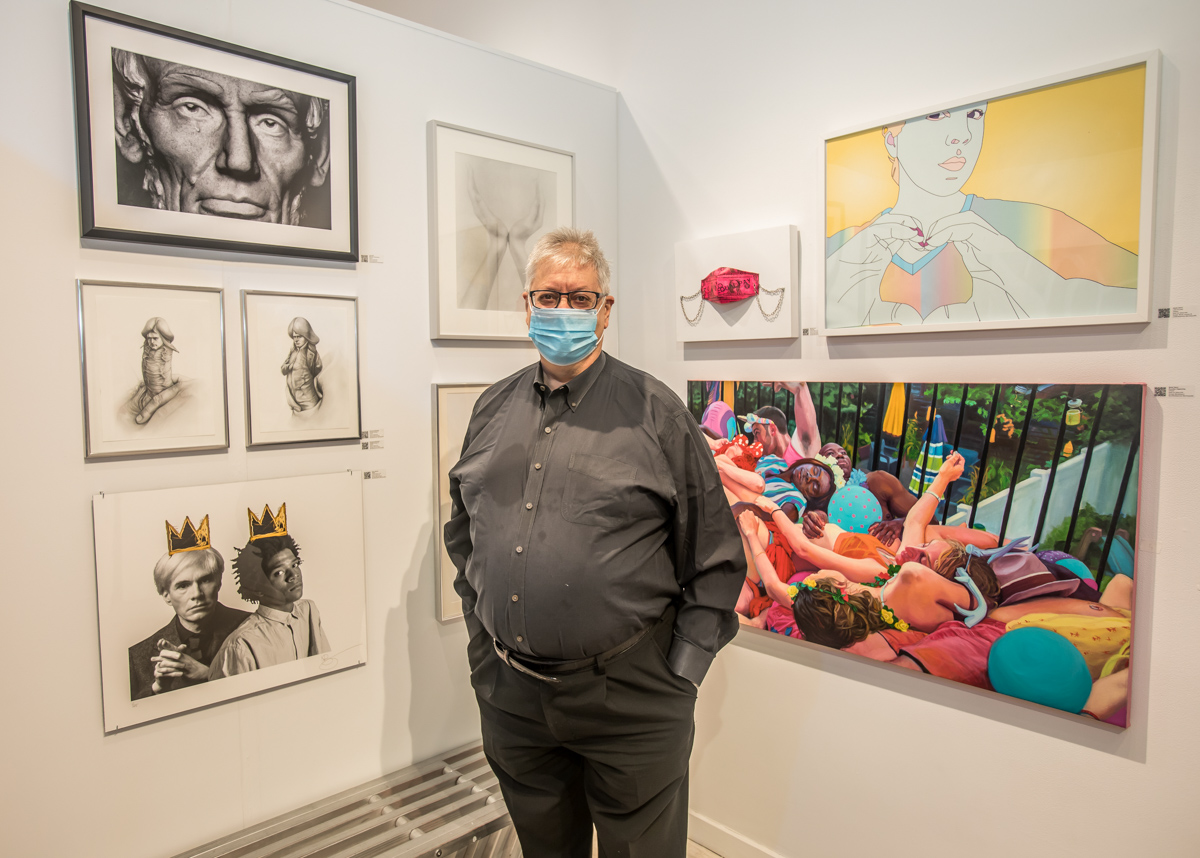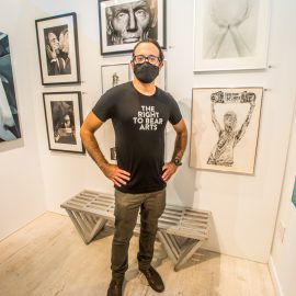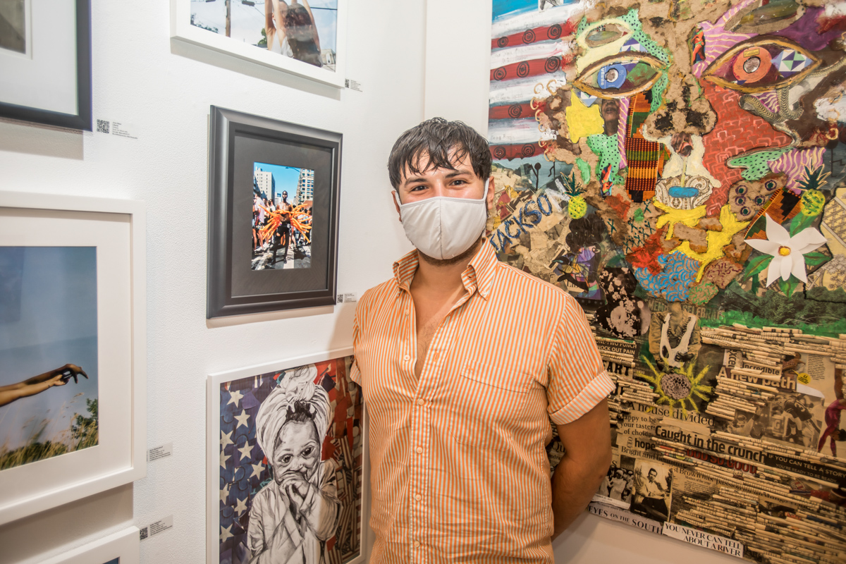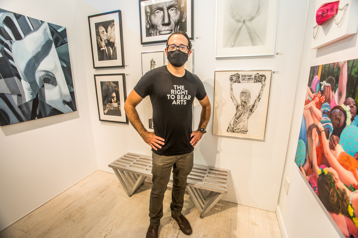 Artist Jose Baez at the "Art4Equality x Life, Liberty, The Pursuit of Happiness" Exhibition Opening Reception at The Untitled Space, presented in collaboration with SaveArtSpace and Art4Equality