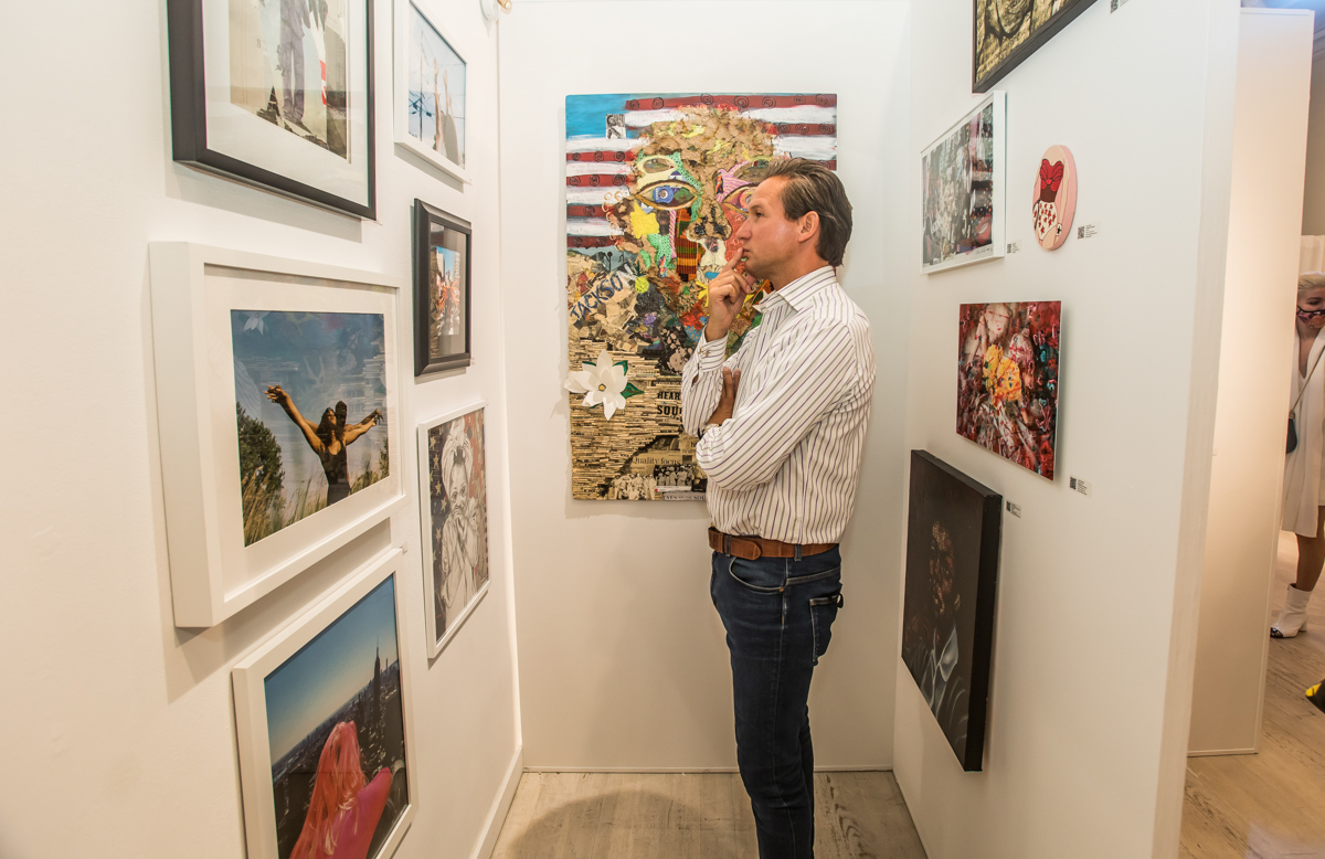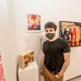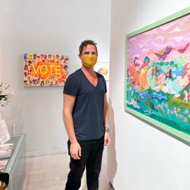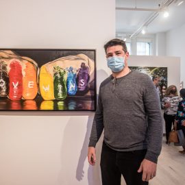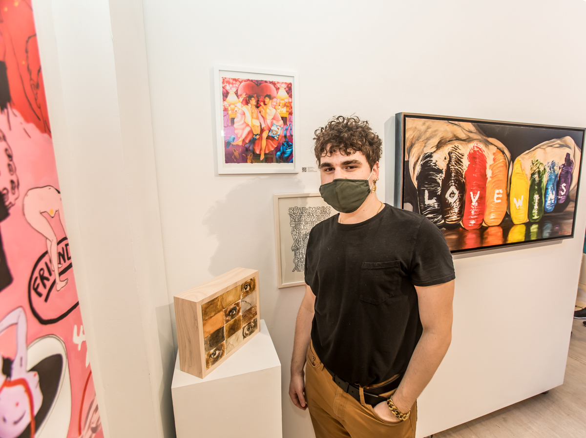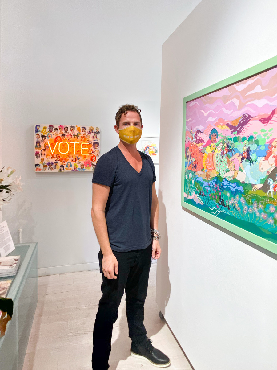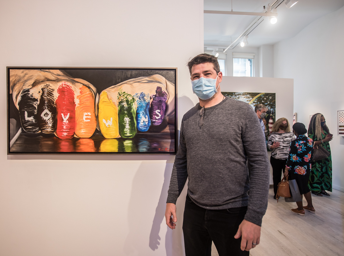 Artist Jared Freschman at the "Art4Equality x Life, Liberty, The Pursuit of Happiness" Exhibition Opening Reception at The Untitled Space, presented in collaboration with SaveArtSpace and Art4Equality