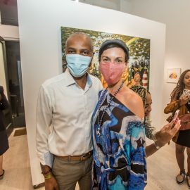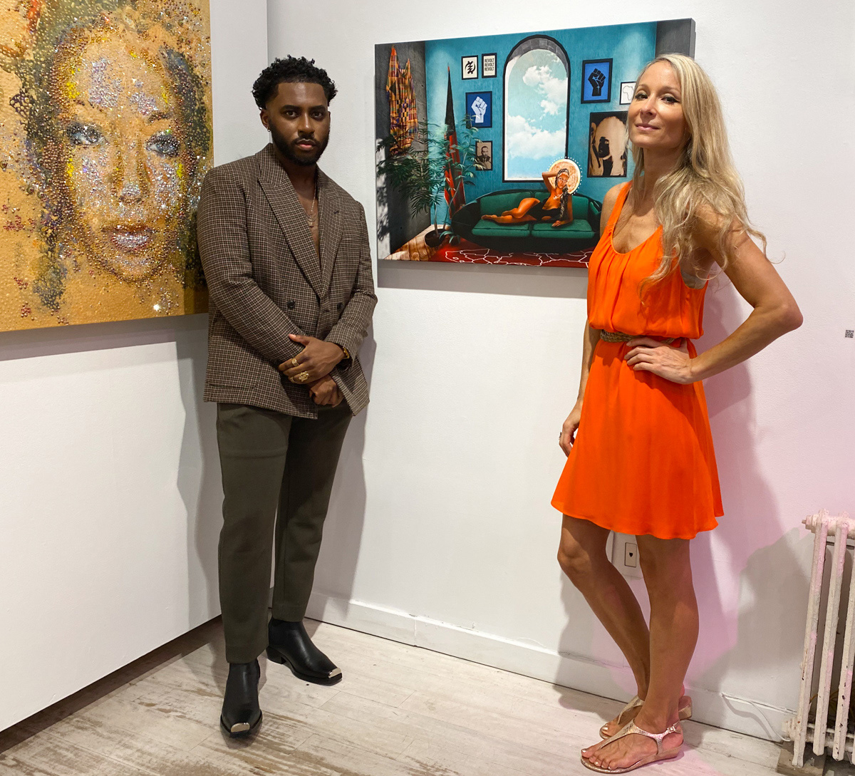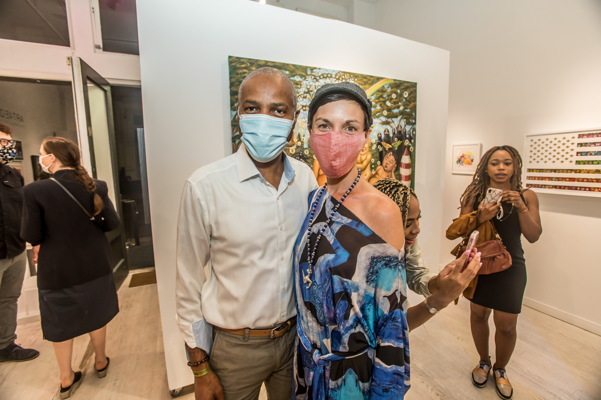 Artist Osaze Stigler and Indira Cesarine at the "Art4Equality x Life, Liberty, The Pursuit of Happiness" Exhibition Opening Reception at The Untitled Space, presented in collaboration with SaveArtSpace and Art4Equality