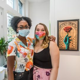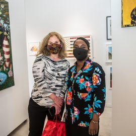 Artist Rachel Van Der Nacht and artist/curator Indira Cesarine at the "Art4Equality x Life, Liberty, The Pursuit of Happiness" Exhibition Opening Reception at The Untitled Space, presented in collaboration with SaveArtSpace and Art4Equality