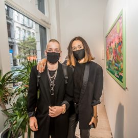 Artist Annika Connor and Artist / Curator Indira Cesarine at the "Art4Equality x Life, Liberty, The Pursuit of Happiness" Exhibition Opening Reception at The Untitled Space, presented in collaboration with SaveArtSpace and Art4Equality