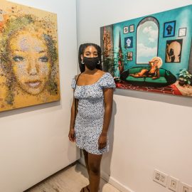 Artist Lola Jiblazee at the "Art4Equality x Life, Liberty, The Pursuit of Happiness" Exhibition Opening Reception at The Untitled Space, presented in collaboration with SaveArtSpace and Art4Equality