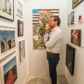 Artist Joel Tretin at the "Art4Equality x Life, Liberty, The Pursuit of Happiness" Exhibition Opening Reception at The Untitled Space, presented in collaboration with SaveArtSpace and Art4Equality