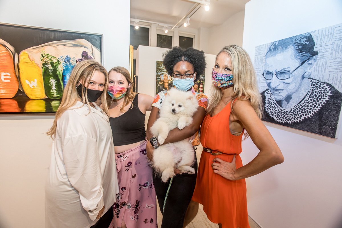 Artist/curator Indira Cesarine with gallery team Tucker Garrison, Alyssa Bryn, and Shenell Mcfarlane (with Echo Romeo Cesarine) at the "Art4Equality x Life, Liberty, The Pursuit of Happiness" Exhibition Opening Reception at The Untitled Space, presented in collaboration with SaveArtSpace and Art4Equality