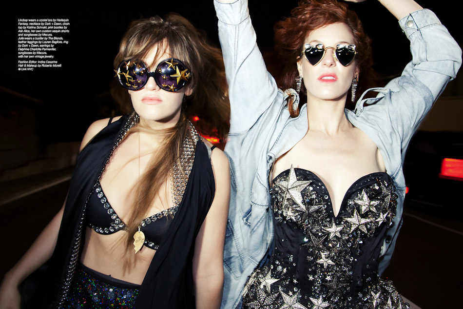 Shot 2: Lindsay wears a crystal bra by Harlequin Fantasy, necklace by Dark + Dawn, chain top by Katrina Schnakl, pink booties by Ask Alice, her own custom sequin shorts and sunglasses by Mecura. Julie wears a bustier by The Blonds, leather leggings by Lauren Bagliore, ring by Dark + Dawn, earrings by Delphine Charlotte Parmentier, sunglasses by Mecura, with her own vintage jewelry.