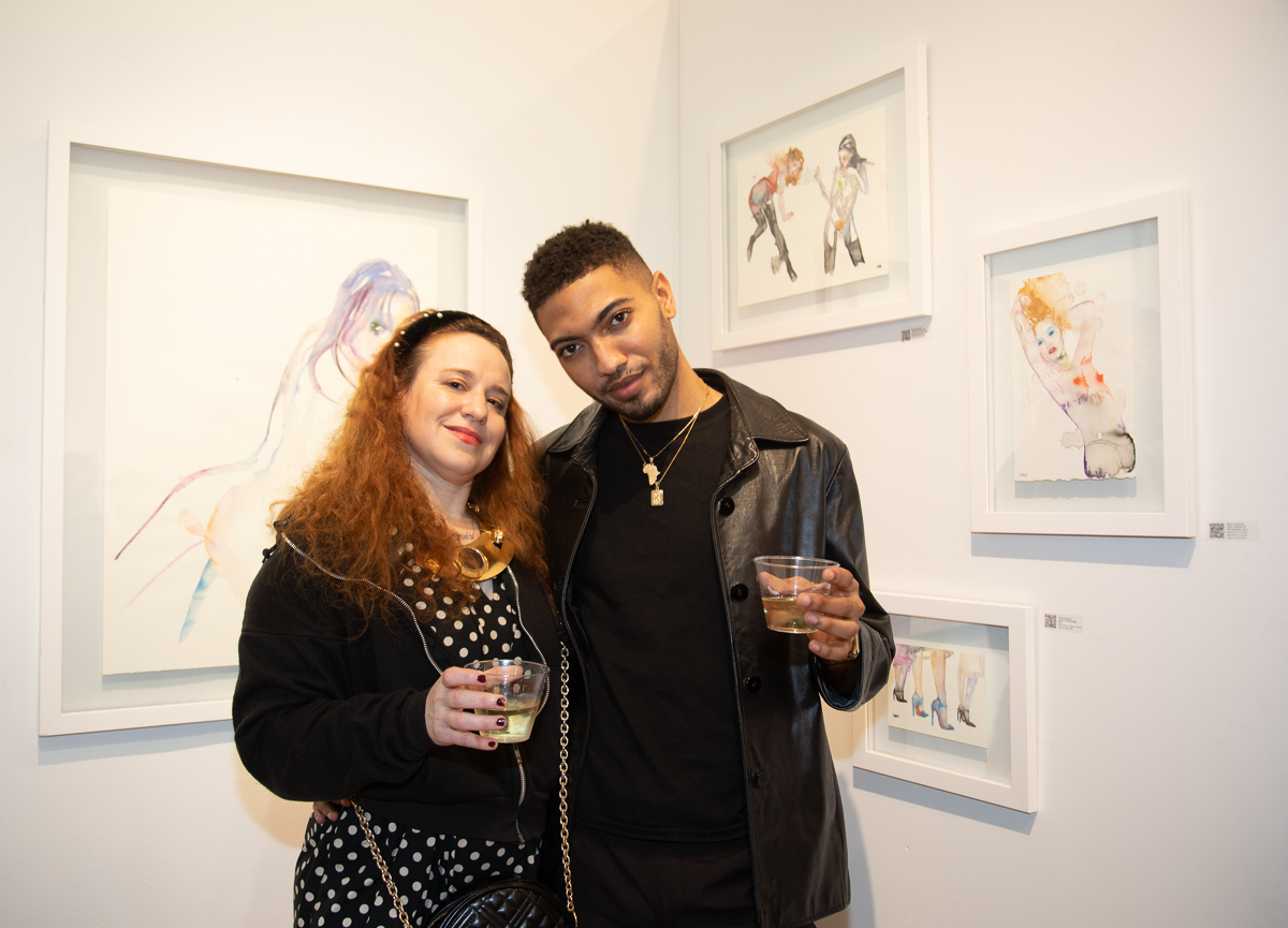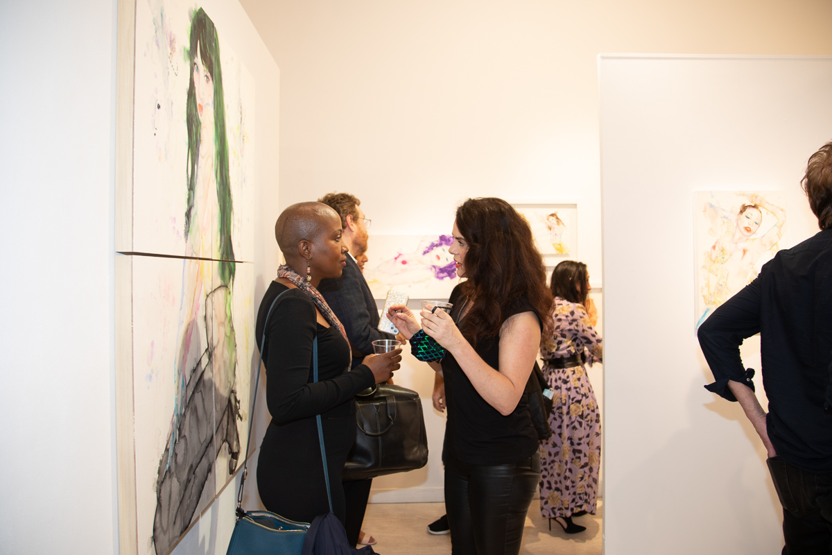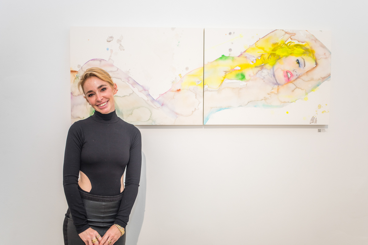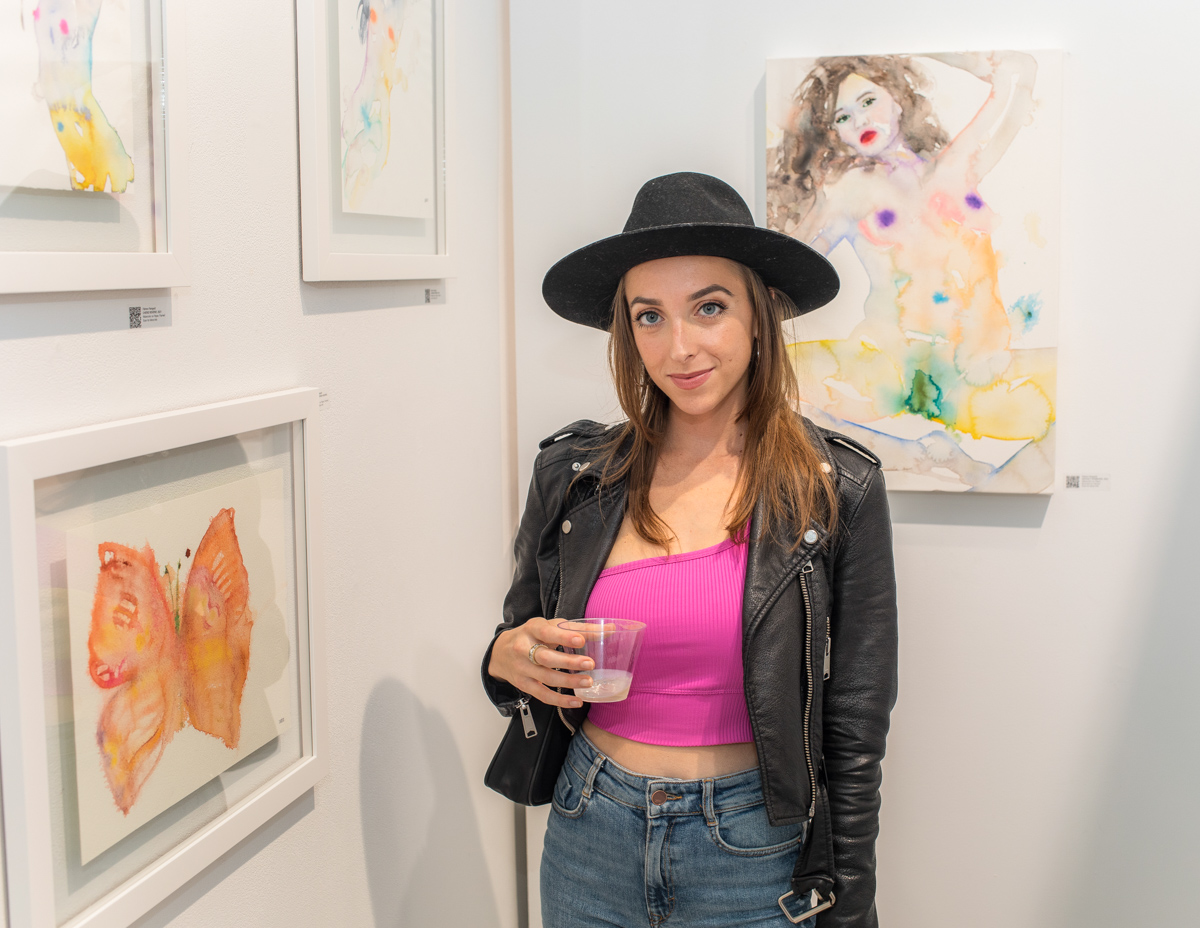 On October 21st, The Untitled Space celebrated the 3rd solo exhibition of artist Fahren Feingold “WET DREAMS,” at the gallery in Tribeca with wine and watercolors. The exhibition, curated by Indira Cesarine, is on view through November 13th, 2021, and premieres the latest series of works on paper and panel by the artist known for her ethereal feminine nudes that emphasize the female gaze through vibrant brush strokes using her signature wet-on-wet watercolor technique.