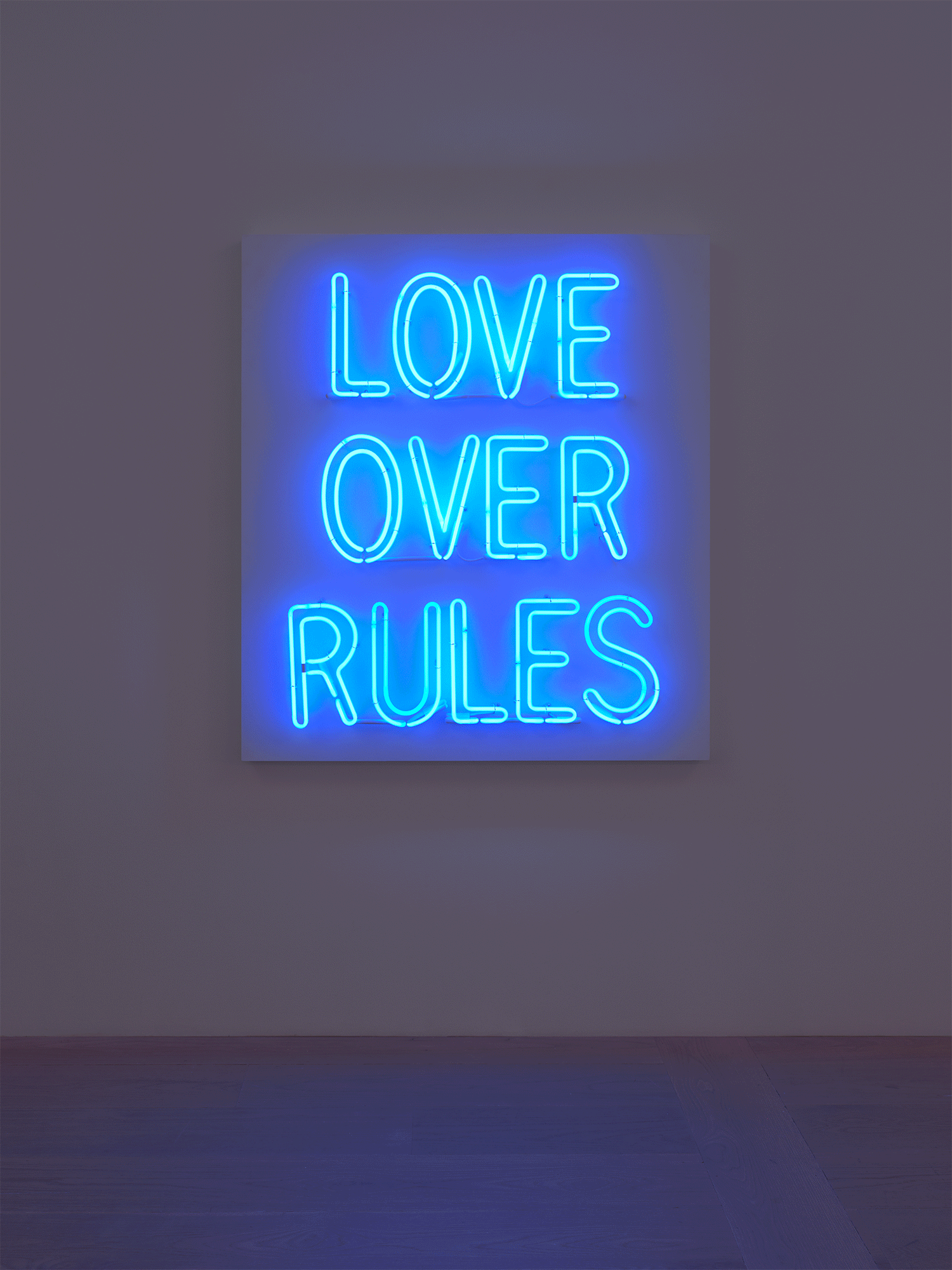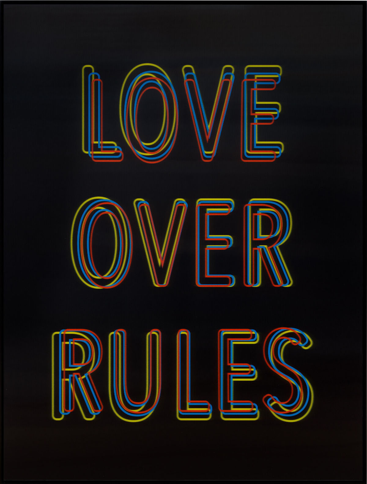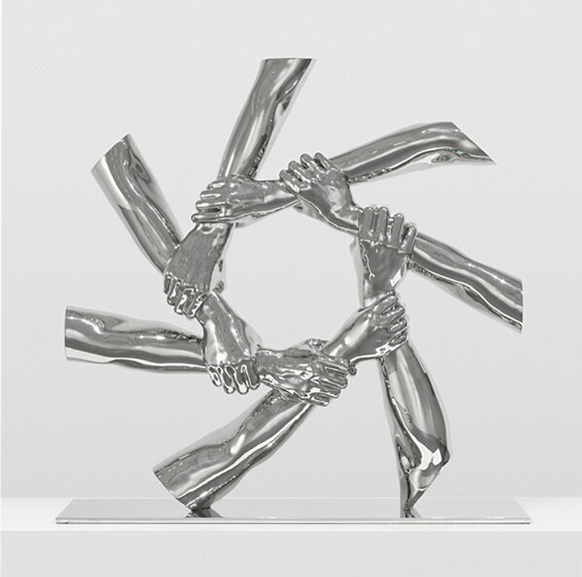 Sculpture plays a central role in the exhibition. Community (2024) isolates the simple gesture of hands and arms linking together, forming a circle that radiates mutual support and connection. E Pluribus Unum (2020), an eight-foot stainless steel arm pointing toward the sky, invites viewers to see themselves reflected in its polished surface, physically implicating them in its symbolism of collective aspiration. The exhibition also features Love Over Rules, a phrase Thomas has used in public artworks—including a prominent neon installation in San Francisco—reimagined here as an intimate yet urgent call to prioritize compassion and human connection above all else.