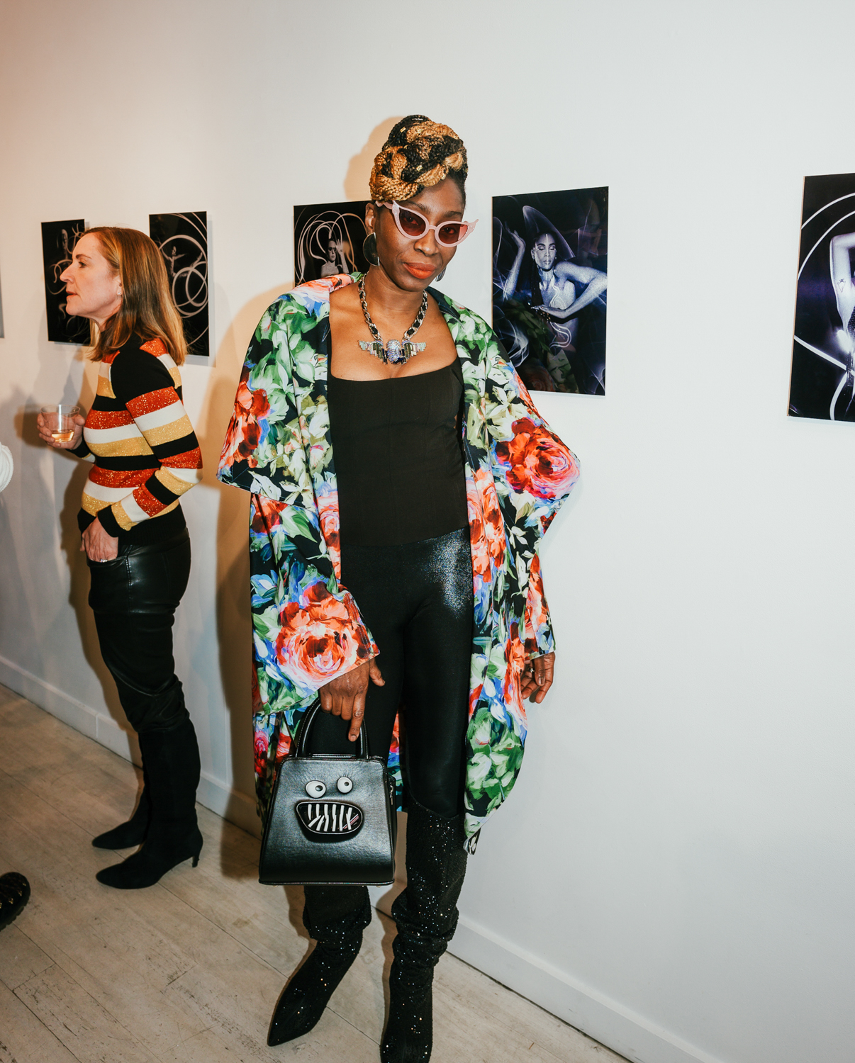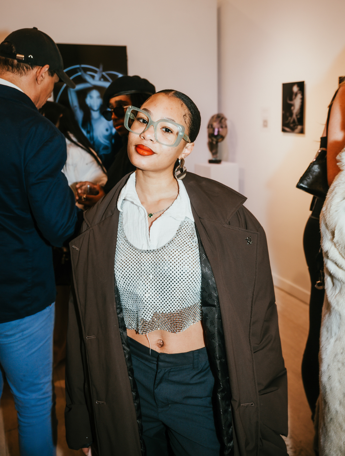 Tinu Naija attends Indira Cesarine's “LUMIÈRE” Solo Exhibition Reception + Artist Talk, Curated by MakersPlace at The Untitled Space (Photography by Jade Greene)