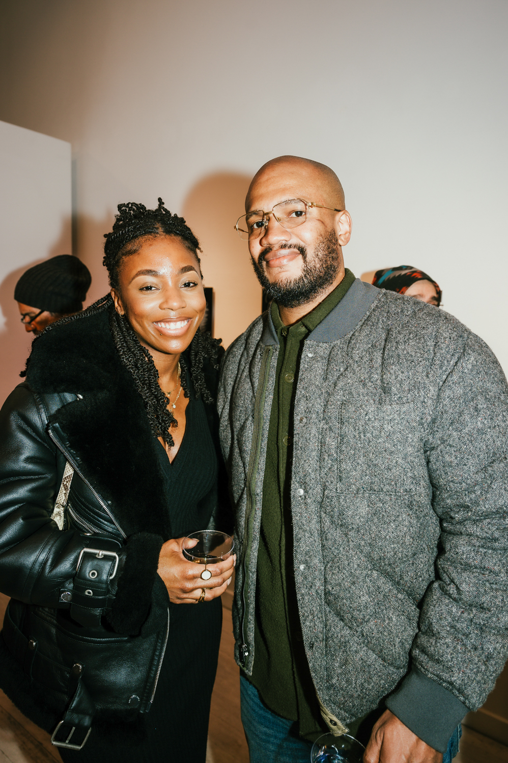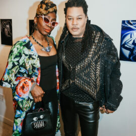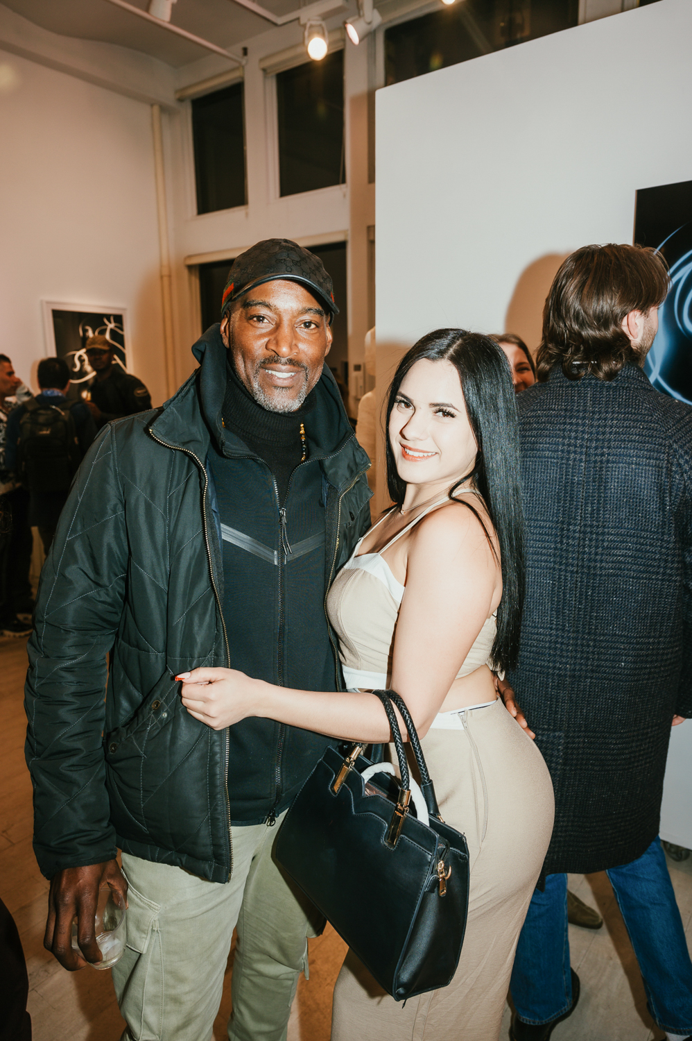 Tinu Naija and Ty-Ron Mayes attend Indira Cesarine's Indira Cesarine “LUMIÈRE” Solo Exhibition Reception + Artist Talk, Curated by MakersPlace at The Untitled Space (Photography by Jade Greene)