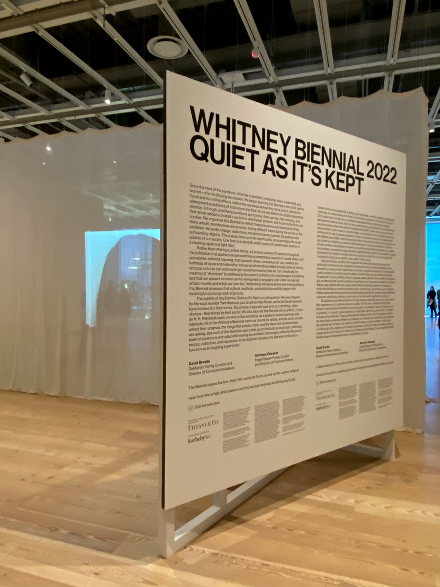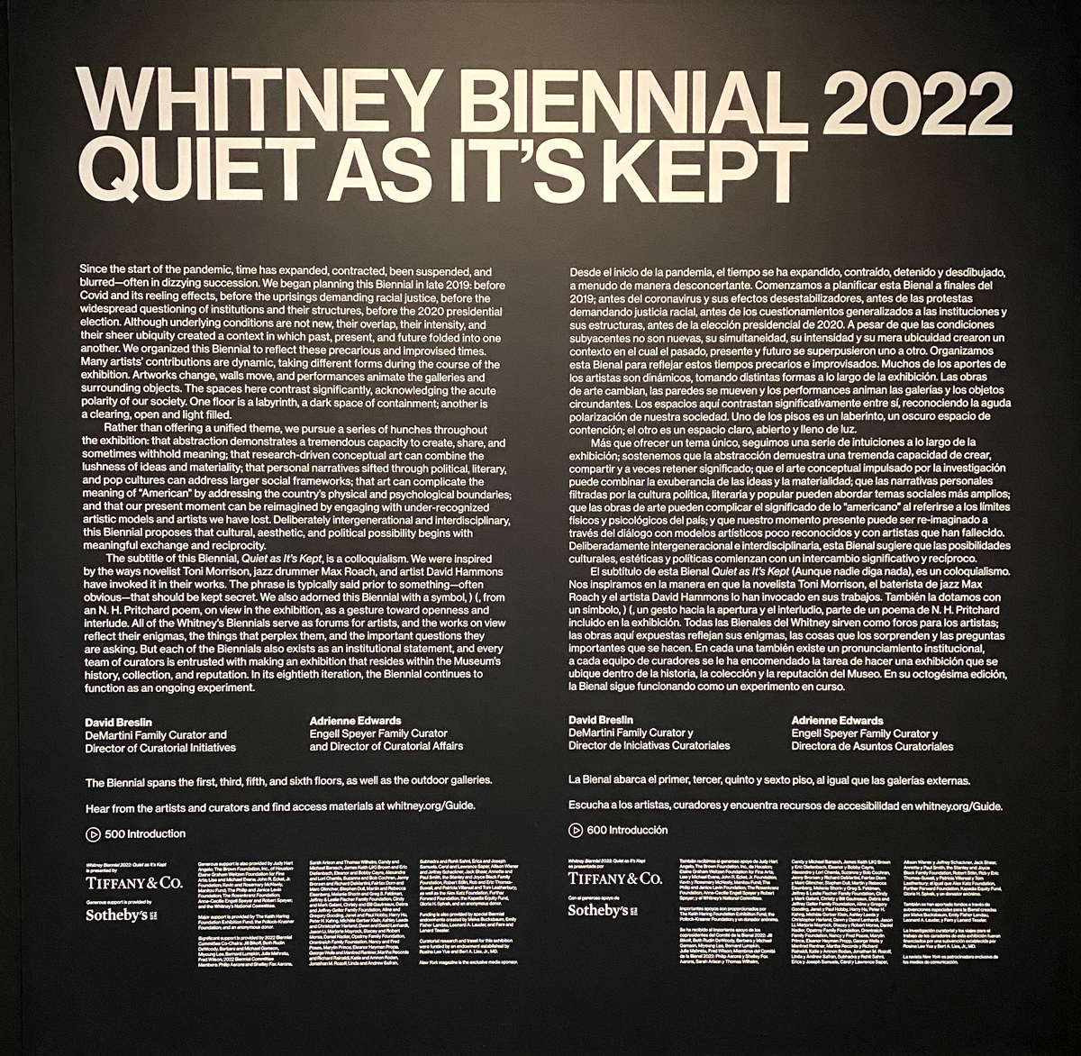 The Whitney Biennial 2022: “Quiet as It’s Kept” is presented by Tiffany & CO, as well as generous support by Judy Hart Angelo; The Brown Foundation, Inc. of Houston, Elaine Graham Weitzen, The Rosenkranz Foundation and the Whitney’s National Committee amongst many others. Major support is provided by The Keith Haring Foundation Exhibition Fund.