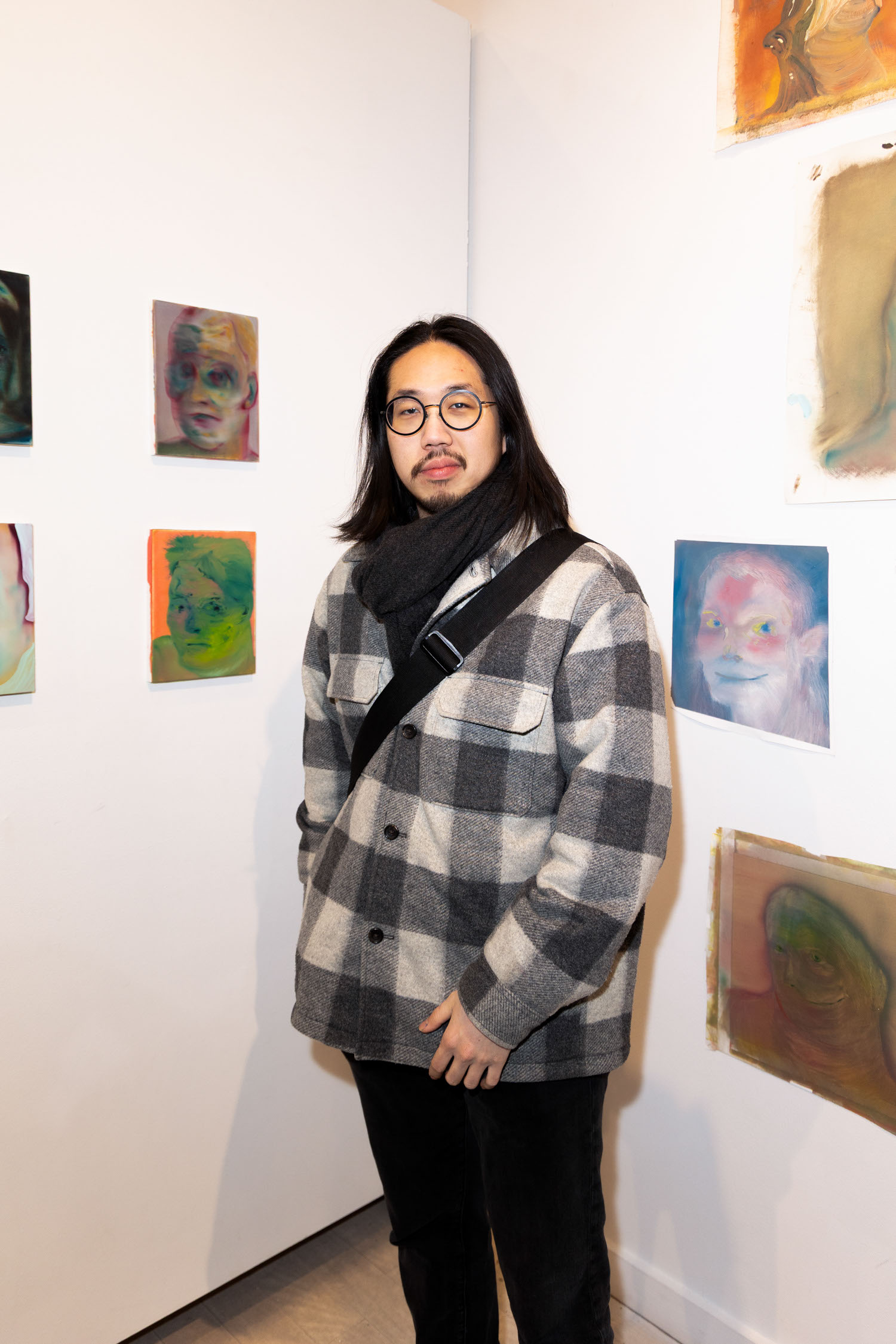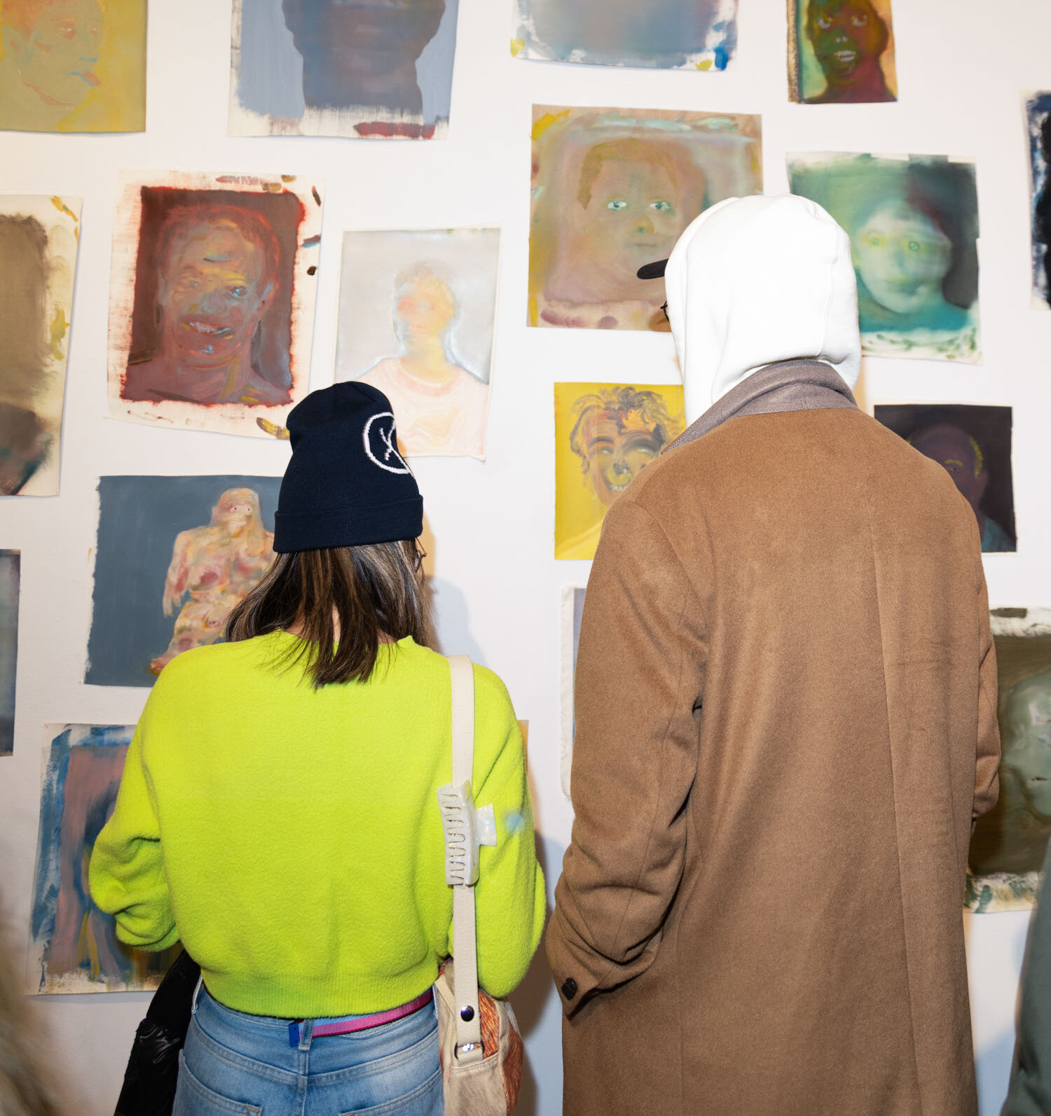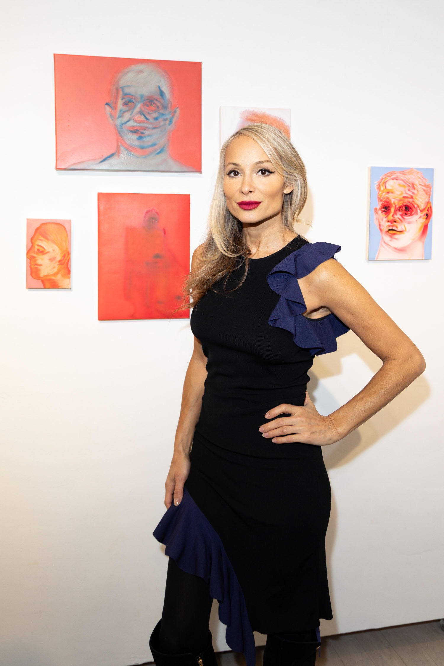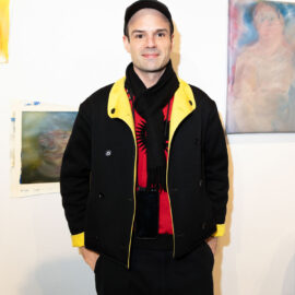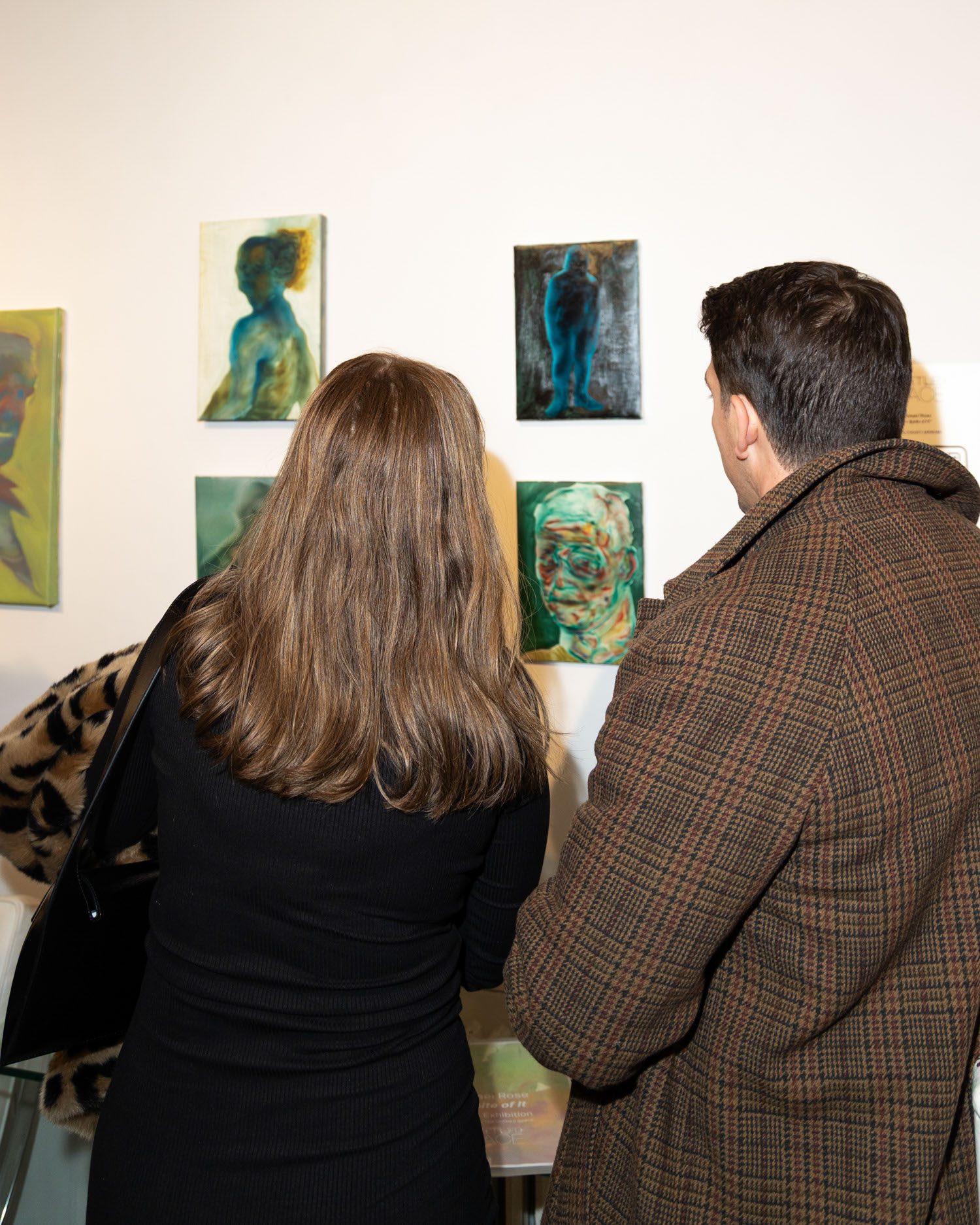 Creator of Bacha House clothing viewing artwork by Artist Michael Rose at his solo exhibition "In Spite of It", The Untitled Space Gallery, New York