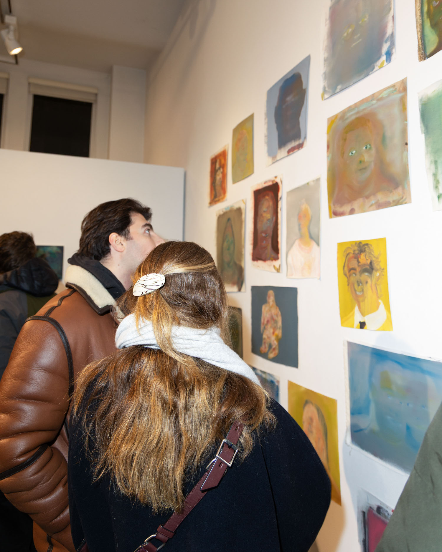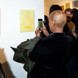 Attendees admire peices at Michael Rose solo exhibition "In Spite of It", The Untitled Space Gallery, New York
