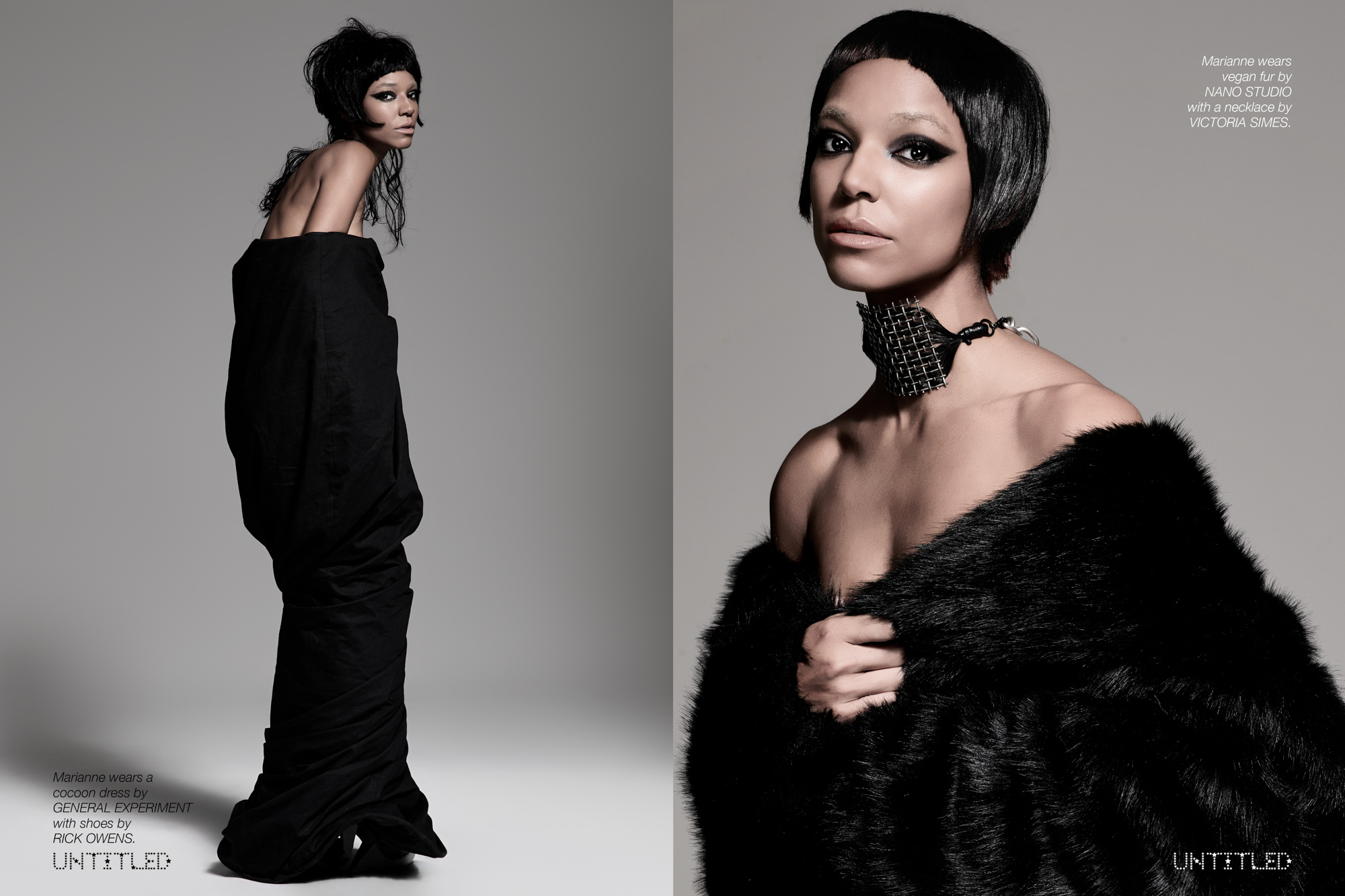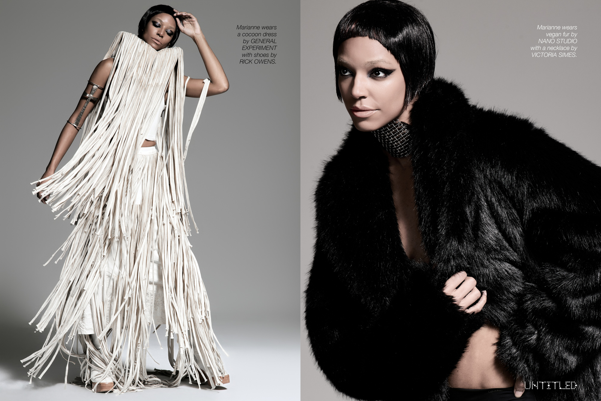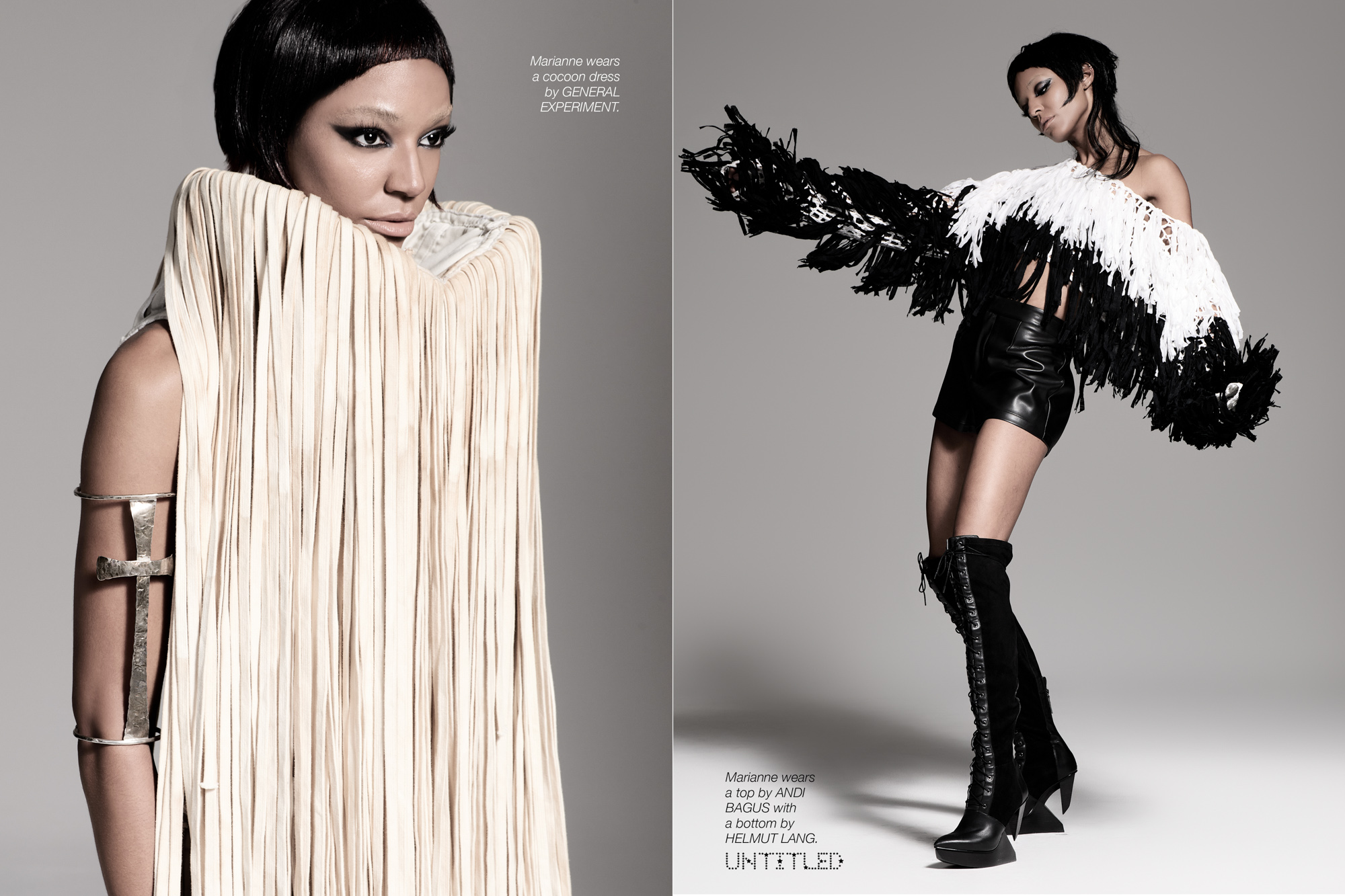 Marianne Photographed by Mateus Porto for The Untitled Magazine. Marianne wears a top by KIM MESCHES.Marianne Photographed by Mateus Porto for The Untitled Magazine. Left Page: Get the beauty look: LUMINOUS SILK FOUNDATION #9 in Tan Neutral Olive and VERTIGO MASCARA in Obsidian Black by ARMANI, concealer #32 Medium Golden by HAUS LABS, SHOW MONO COULEUR eyeshadow #098 Pied De Poule by DIOR, gel pencil liner “Glide or Die” by MAC, and LUXURY LIPSTICK in Nude by IMAN. Right Page: Marianne wears a top by KIM MESCHES with shorts by JEANNIE MAI × INC.Marianne Photographed by Mateus Porto for The Untitled Magazine. Left Page: Marianne wears a cocoon dress by GENERAL EXPERIMENT. Right Page: Marianne wears a top by ANDI BAGUS with a bottom by HELMUT LANG.Marianne Photographed by Mateus Porto for The Untitled Magazine. Left Page: Marianne wears a cocoon dress by GENERAL EXPERIMENT with shoes by RICK OWENS. Right Page: Marianne wears vegan fur by NANO STUDIO with a necklace by VICTORIA SIMES.Marianne Photographed by Mateus Porto for The Untitled Magazine. Left Page: Marianne wears a dress by KIM MESCHES with boots by AIGLE. Right Page: Marianne wears a poem biker jacket by GENERAL EXPERIMENT.Marianne Photographed by Mateus Porto for The Untitled Magazine. Left Page: Marianne wears a cocoon dress by GENERAL EXPERIMENT with shoes by RICK OWENS.Marianne Photographed by Mateus Porto for The Untitled Magazine. Left Page: Marianne wears a poem biker jacket by GENERAL EXPERIMENT with boots by UNITED NUDE × LADY GAGA. Right Page: Marianne wears a poem biker jacket by GENERAL EXPERIMENT.Marianne Photographed by Mateus Porto for The Untitled Magazine. Both Pages: Marianne wears a poem biker jacket by GENERAL EXPERIMENT with boots by UNITED NUDE × LADY GAGA.Marianne Photographed by Mateus Porto for The Untitled Magazine. Left Page: Marianne wears a cocoon dress by GENERAL EXPERIMENT. Right Page: Marianne wears a top by KIM MESCHES.Marianne Photographed by Mateus Porto for The Untitled Magazine. Marianne wears a top by ANDI BAGUS.