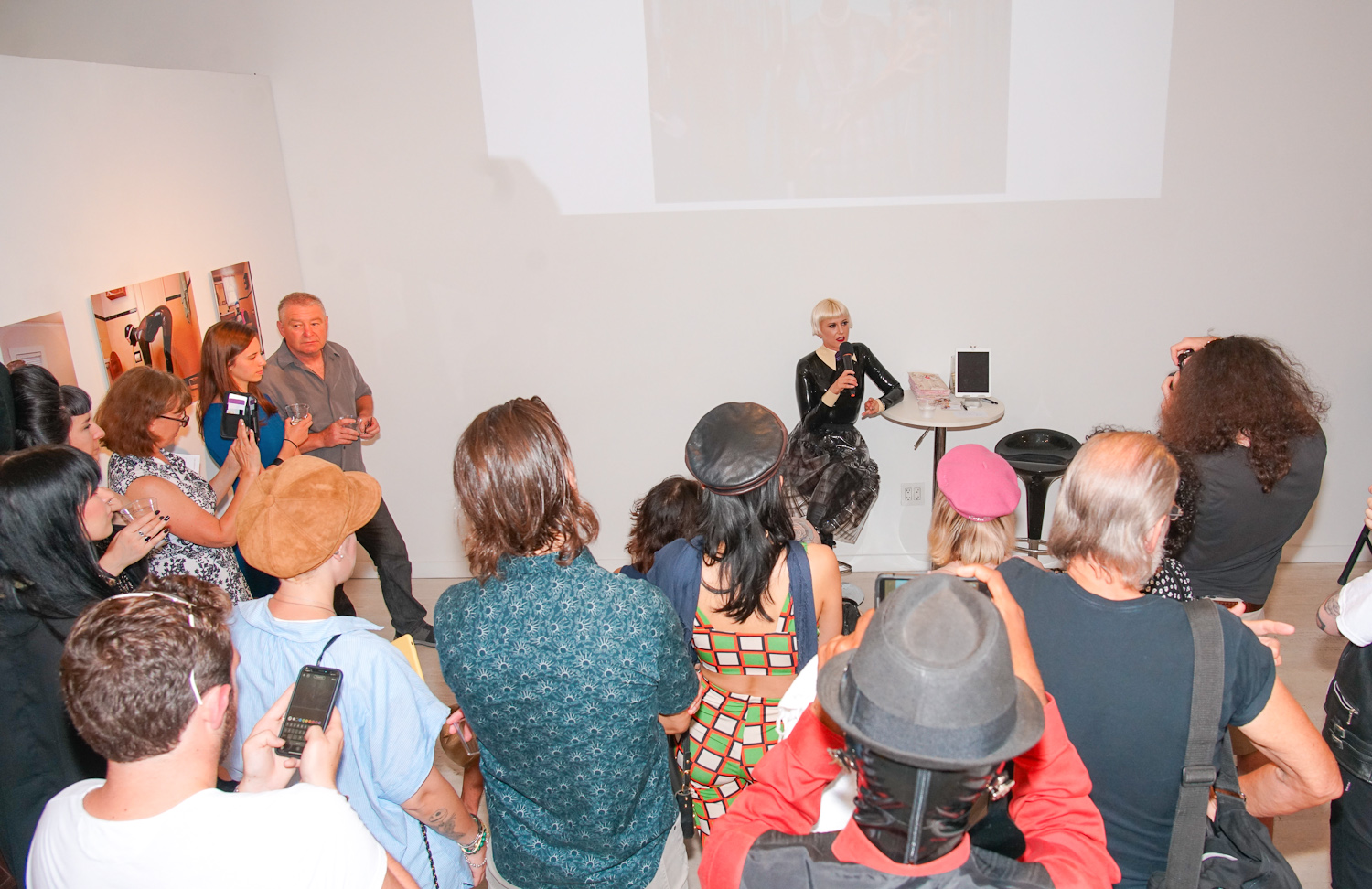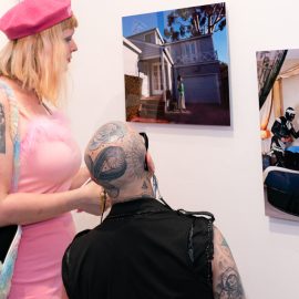 During her artist talk at the opening, Toronto explained how she started to use self-portraits and her alter ego as a way to resist self-harming after her hysterectomy and the breakdown of her first marriage. “I learned how to do special effects makeup and I took self-portraits with a polaroid camera,” Kat said. “That’s where the ‘Meatface’ thing came from. In my early photographs I have all sorts of wounds on my face.”