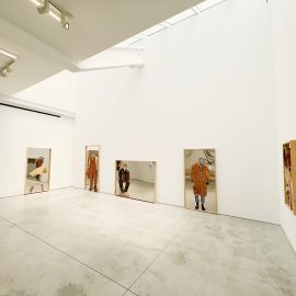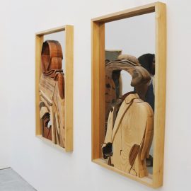 The collection’s wooden wall sculptures are placed over mirror finish stainless steel. The faces of the work’s subjects are missing so that the observer can place their own face into the artwork by looking into the mirror. “You’re able to really put yourself in the position of others, while also maybe seeing yourself in the space where you wouldn’t necessarily have thought to see,” said Robinson, who flew to New York from Portland for the artist reception.