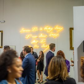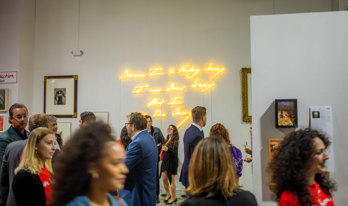 On Tuesday, October 25th, the New York Academy of Art hosted its 30th Take Home a Nude auction at Chelsea Industrial, this year honoring British mixed-media artist Tracey Emin. The annual benefit, which marked the artist’s first appearance in the United States in six years, raises funds for public programming and scholarships at the graduate art school in Tribeca. On display at the event was Emin’s lastest neon artwork created exclusively for the New York Academy, a large-scale neon sculpture that read, “Because I’m So Fucking Sexy, I Was Born Sexy, And I Will Die Sexy,” in yellow lettering spanning eight feet across, which sold in the live auction for over $100,000 USD.