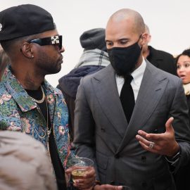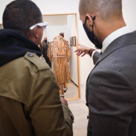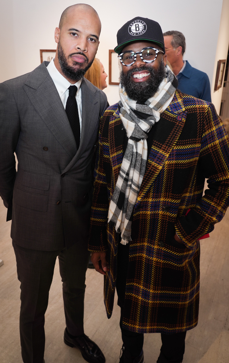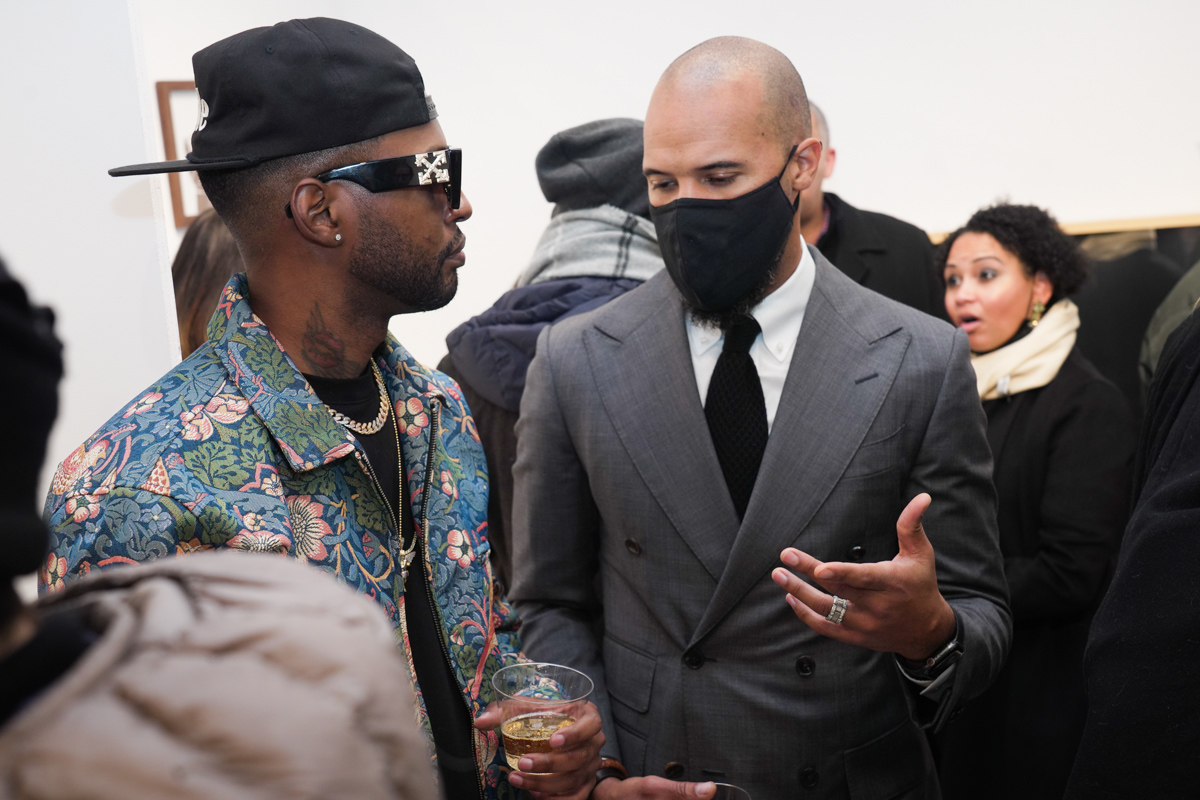 Oliver Smiles and Tony Marx at the Philip A. Robinson Jr. "Old Talks with New Icons" Exhibit Opening Reception, November 20, 2021, The Untitled Space, Tribeca, NY