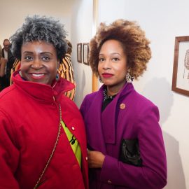 Julie Stample and Judith Hammerman attend Philip A. Robinson Jr. "Old Talks with New Icons" Exhibit Opening Reception, November 20, 2021, The Untitled Space, Tribeca, NY