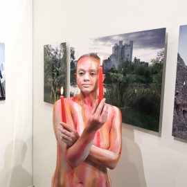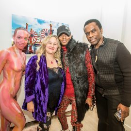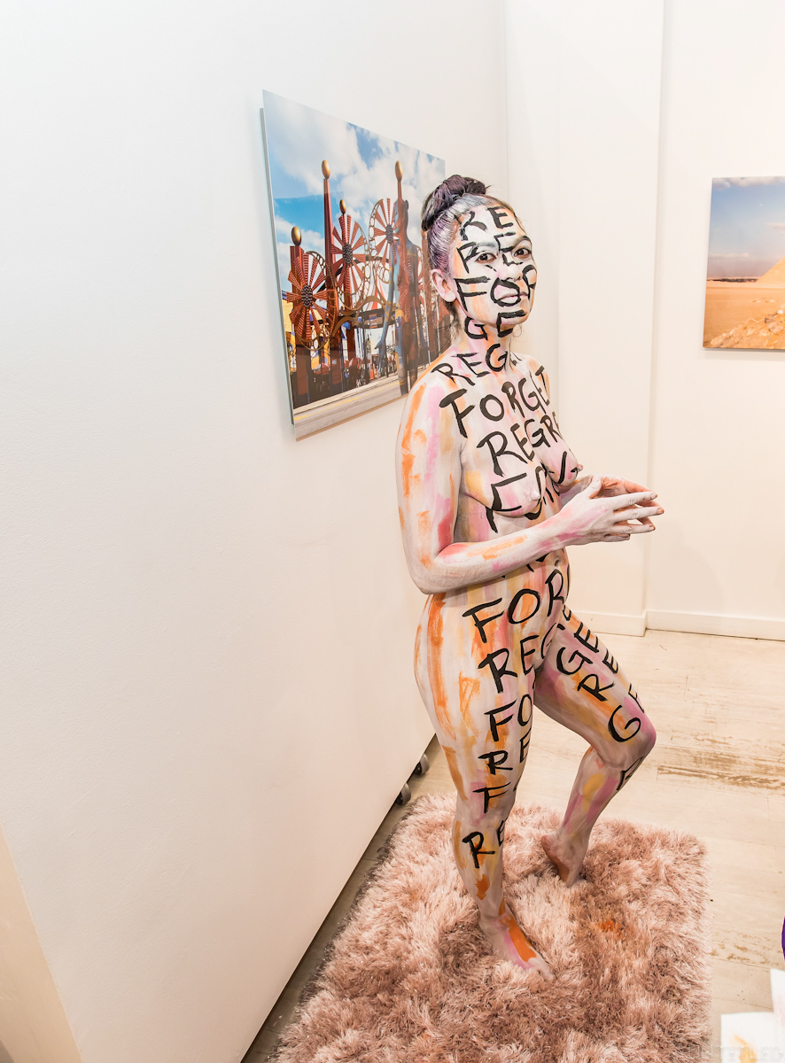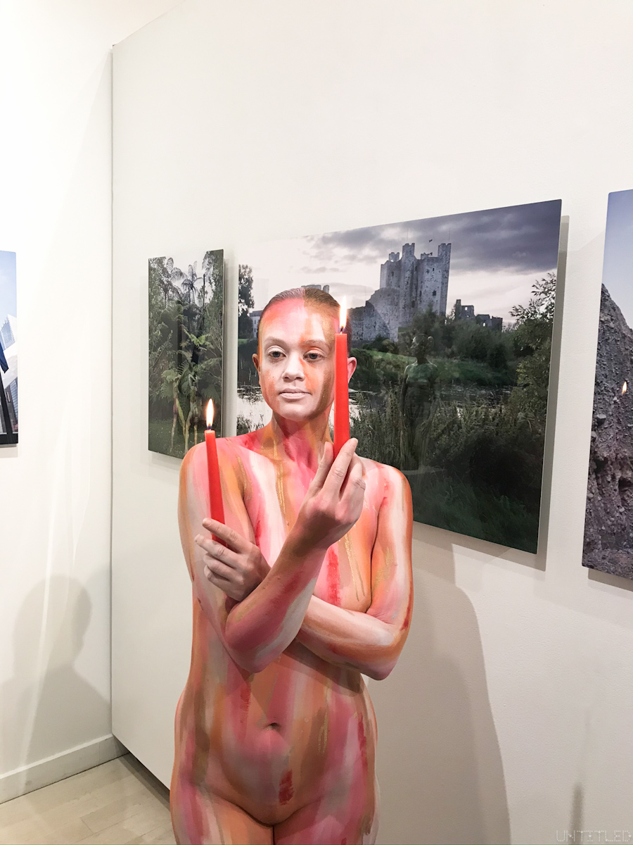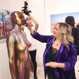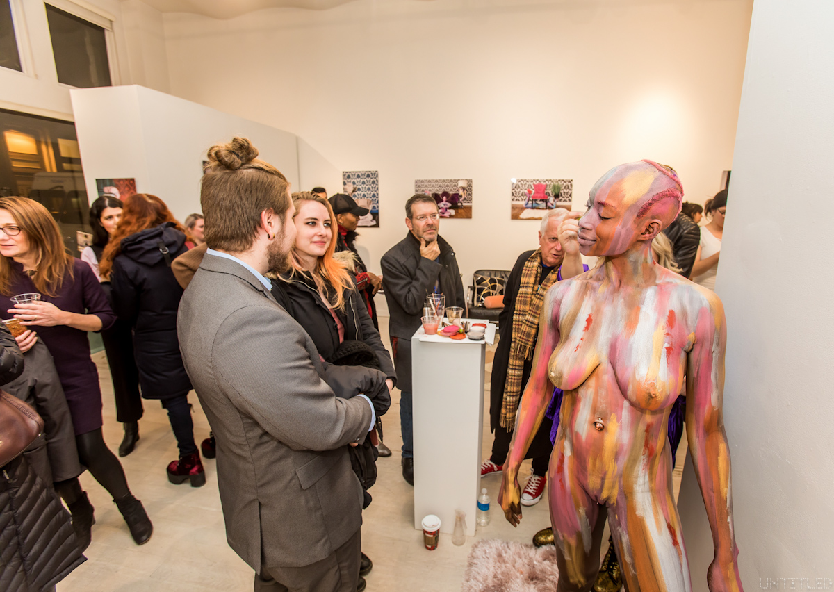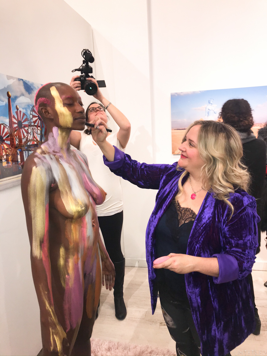 Celebrated body paint artist Trina Merry presented her powerful exhibit and live performance “Objectified” on November 14th at The Untitled Space. The exhibition (on view through November 16th) and performance was curated by gallery director Indira Cesarine and the opening coincided with Tribeca Art + Culture Night. Throughout the night, models covered head-to-toe in body paint enthralled the audience by posing with lampshades, cakes, and candles, as music played throughout the night, seamlessly communicating the artist’s statement. Visitors could watch as Merry painted the models, giving the public a rare glimpse at how an artist works.