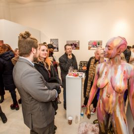 The addition of the live performance added to the excitement of the evening. Guests were in awe of the models’ ability to contort themselves into tricky and unique positions. Everyone was appreciative of the chance to interact with the exhibit in a more impressionable way than just engaging with photographs on the wall, it brought the artists work literally to life. Wine and chocolates were served throughout the evening.