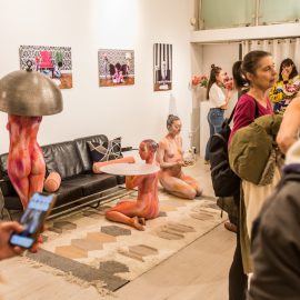 Artist Trina Merry and guests at "Objectified" Trina Merry performance and exhibition, The Untitled Space Gallery, New York. Photography by Mikhail Torich