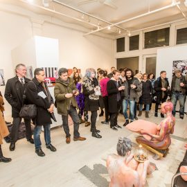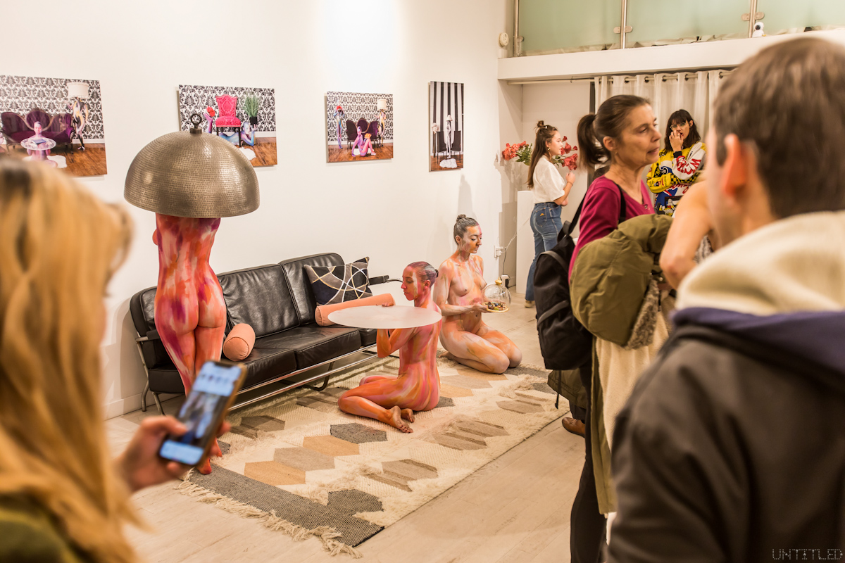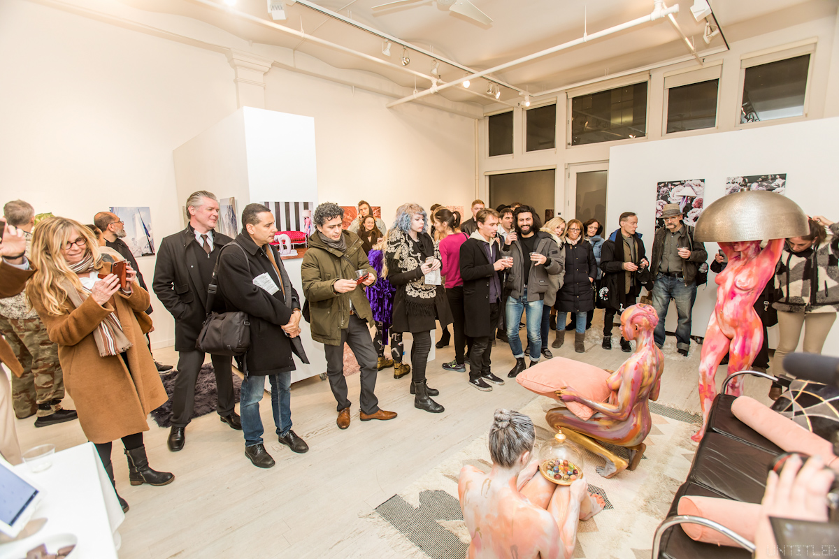 Guests enjoying "Objectified" Trina Merry performance and exhibition, The Untitled Space Gallery, New York. Photography by Mikhail Torich
