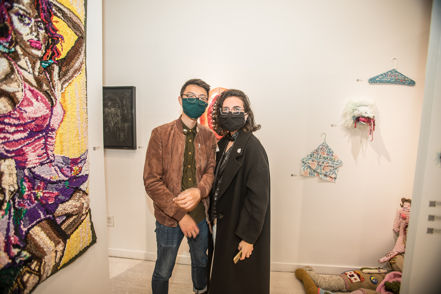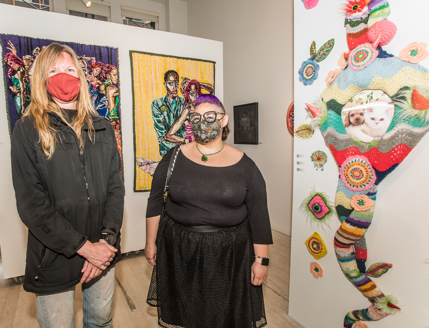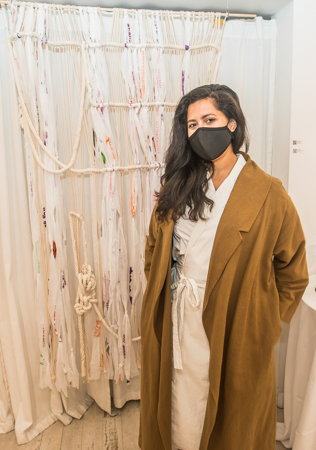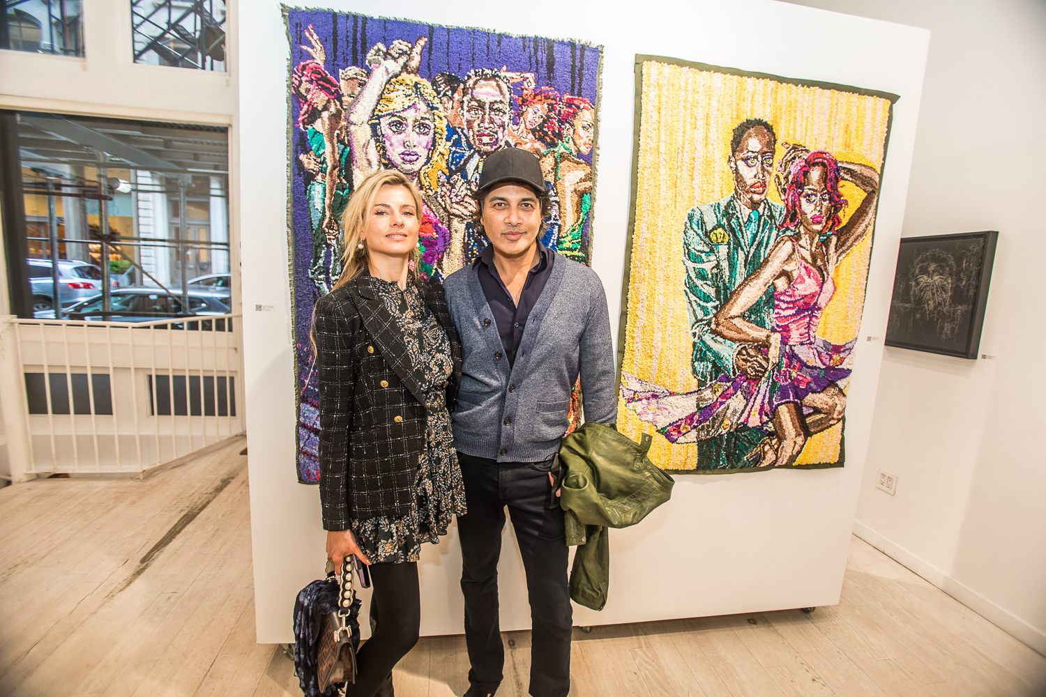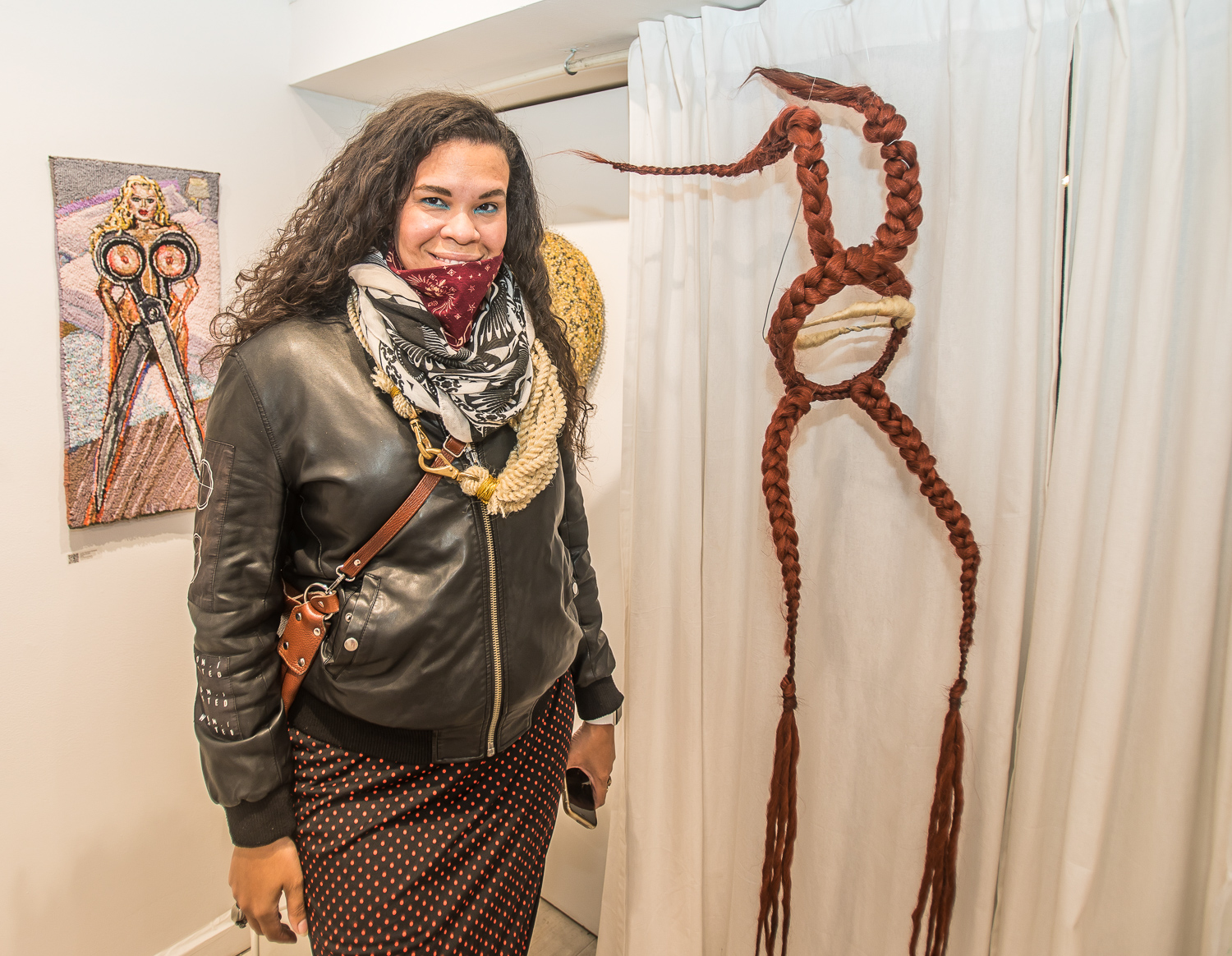 Indira Cesarine with artwork by Elise Drake "UNRAVELED: Confronting The Fabric of Fiber Art" Group Show, The Untitled Space gallery, New York
