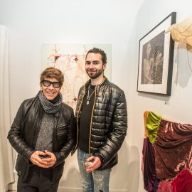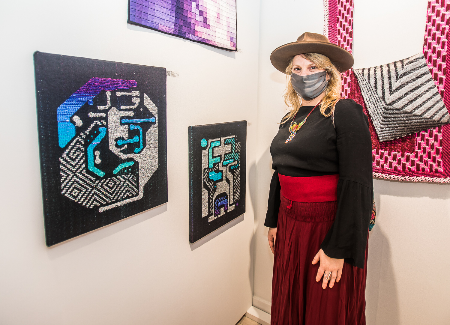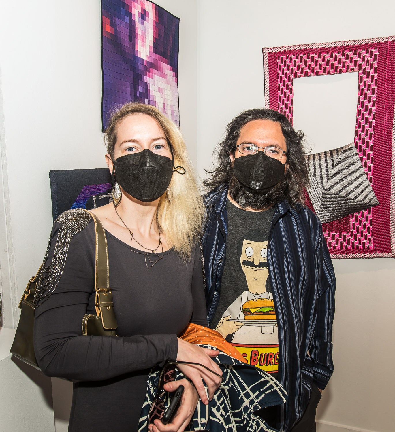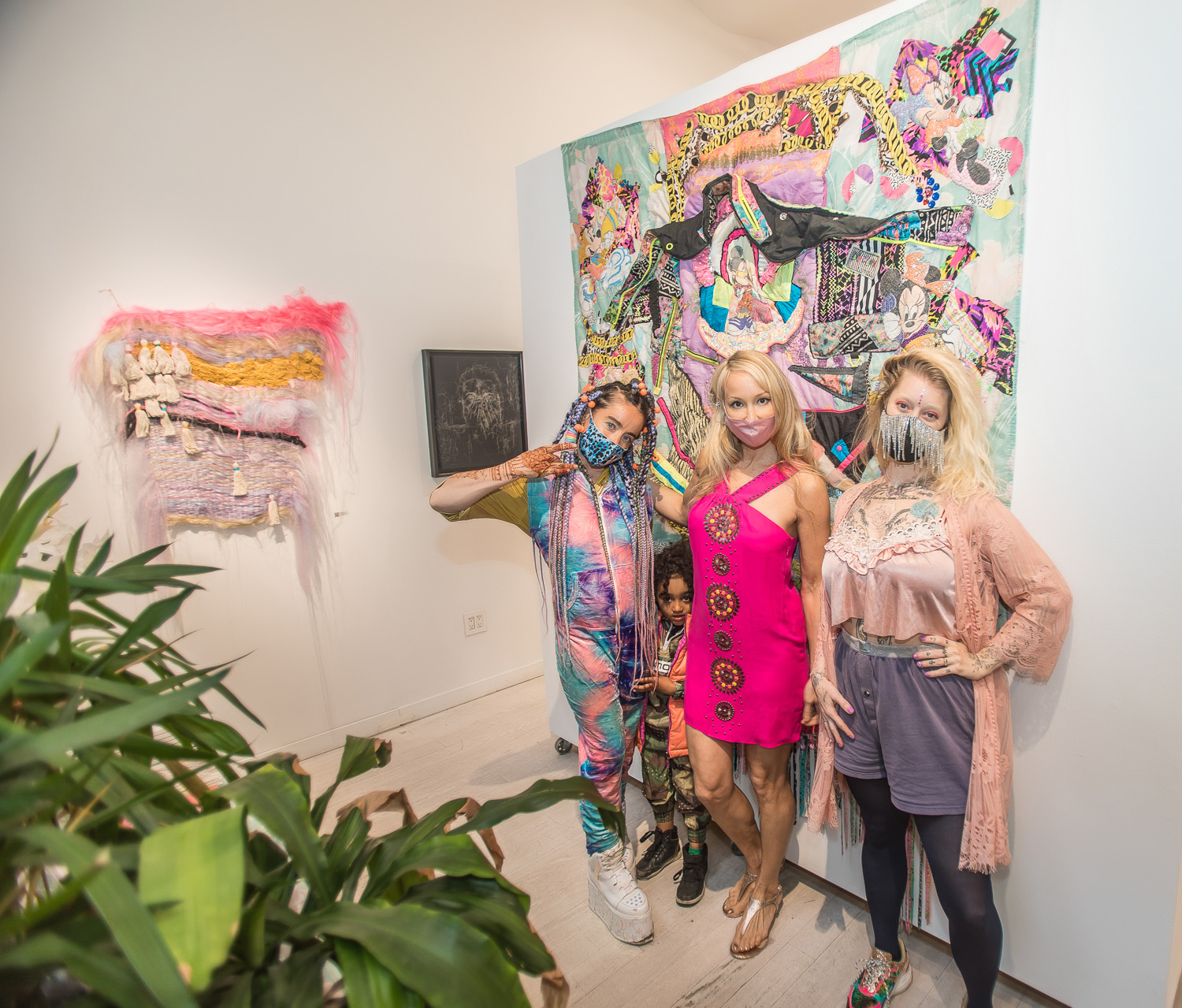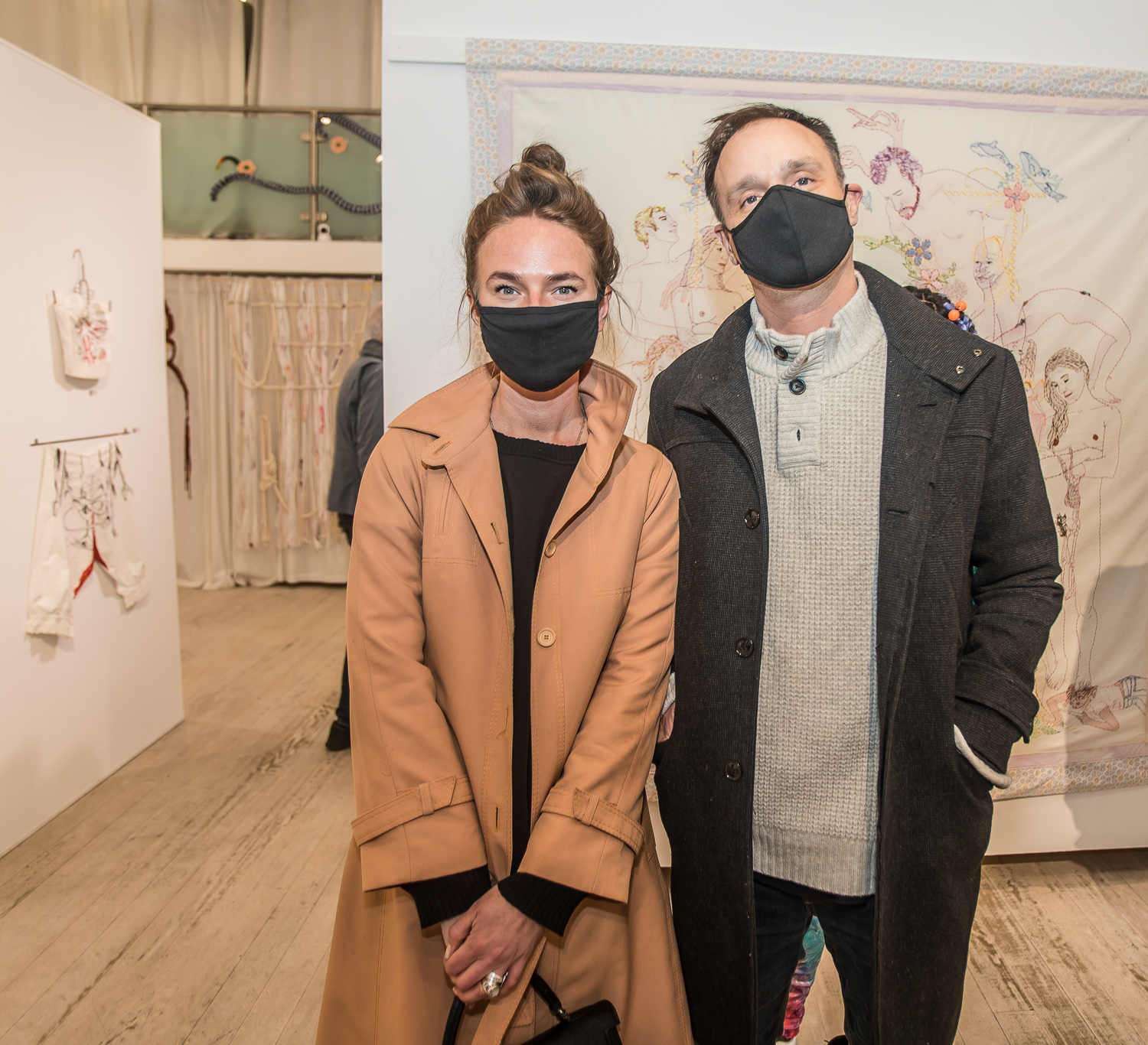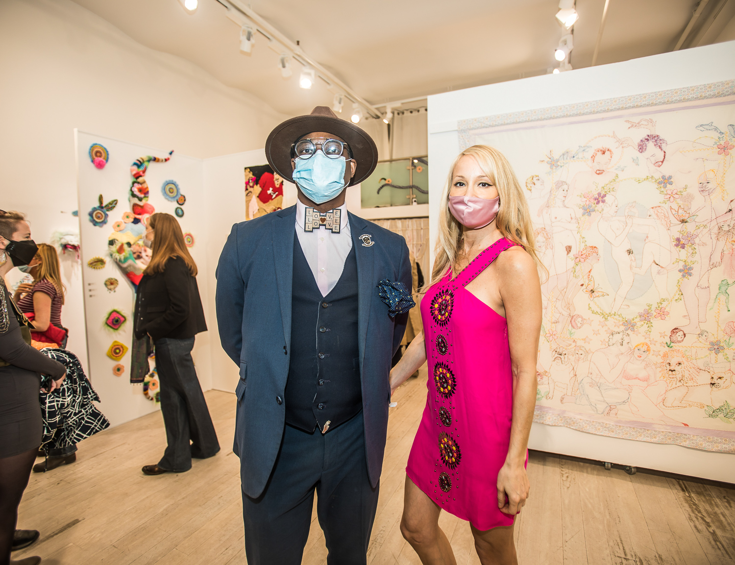Indira Cesarine with artwork by Elise Drake "UNRAVELED: Confronting The Fabric of Fiber Art" Group Show, The Untitled Space gallery, New York