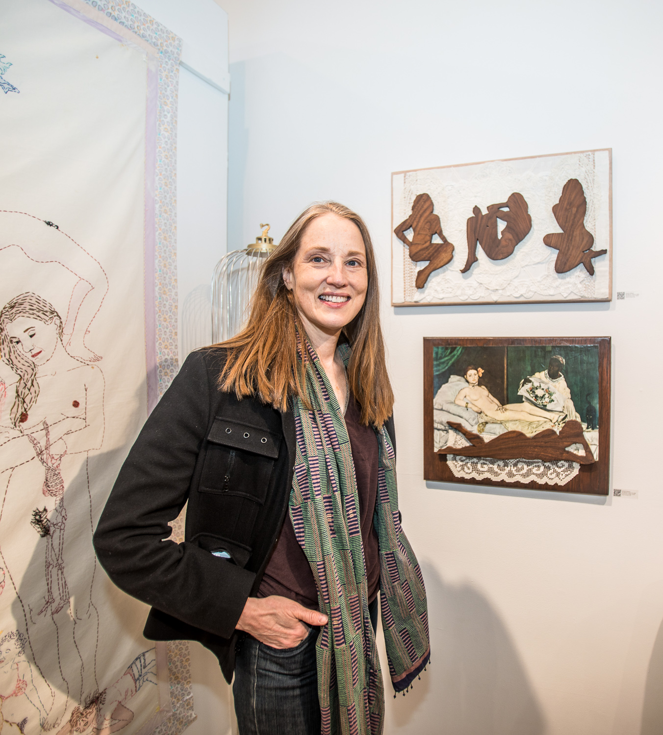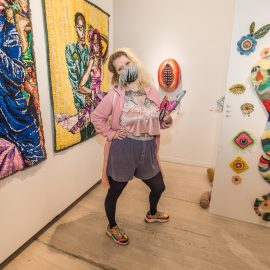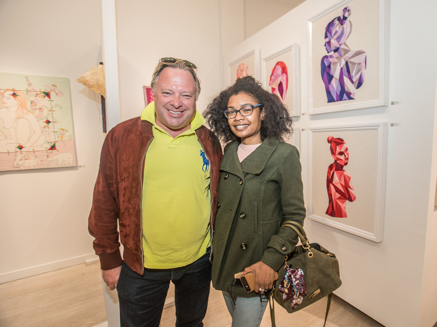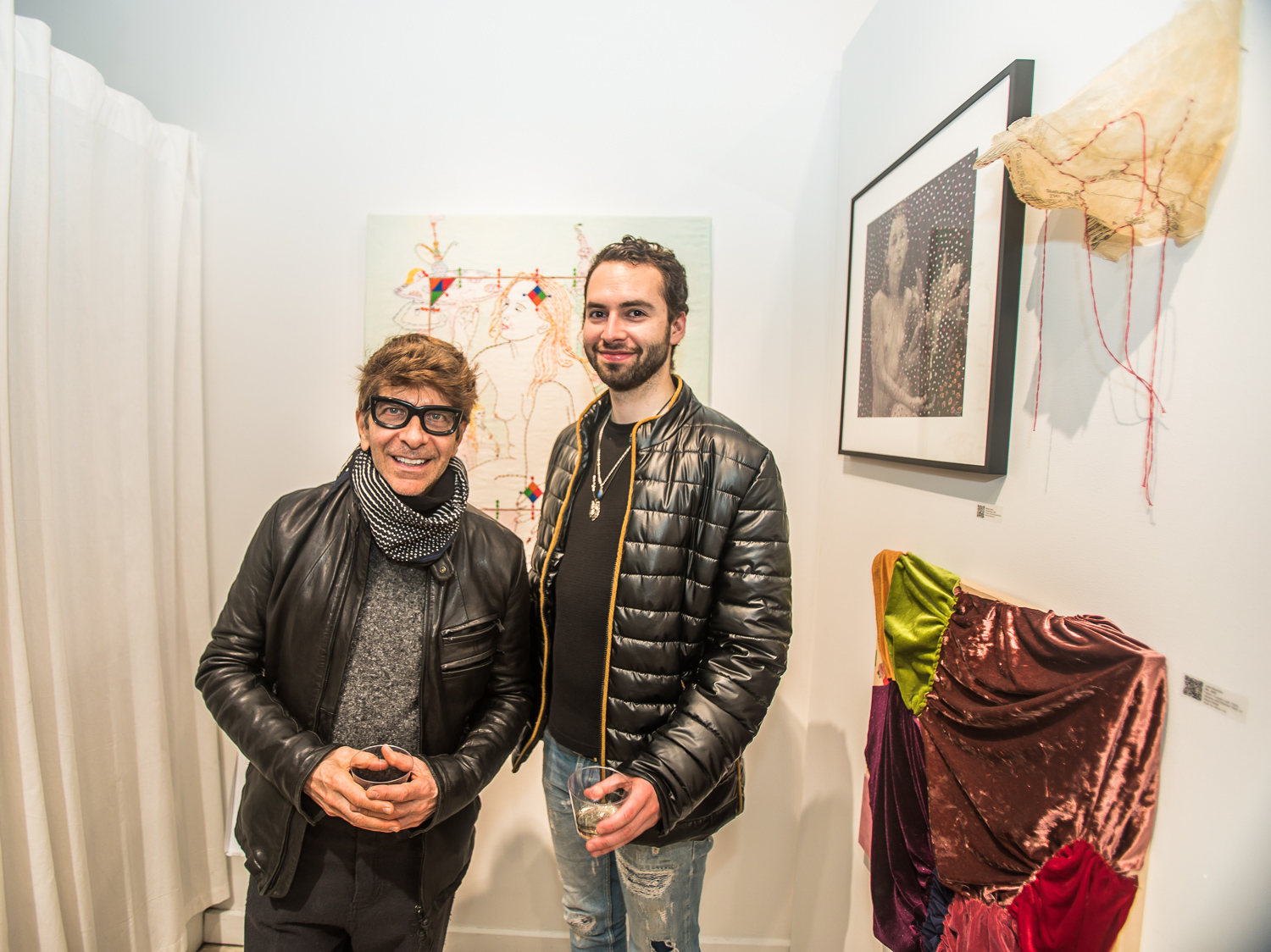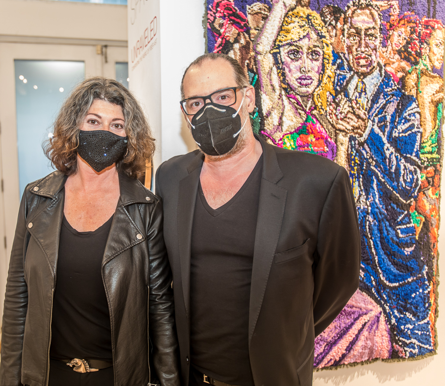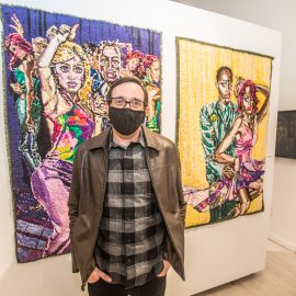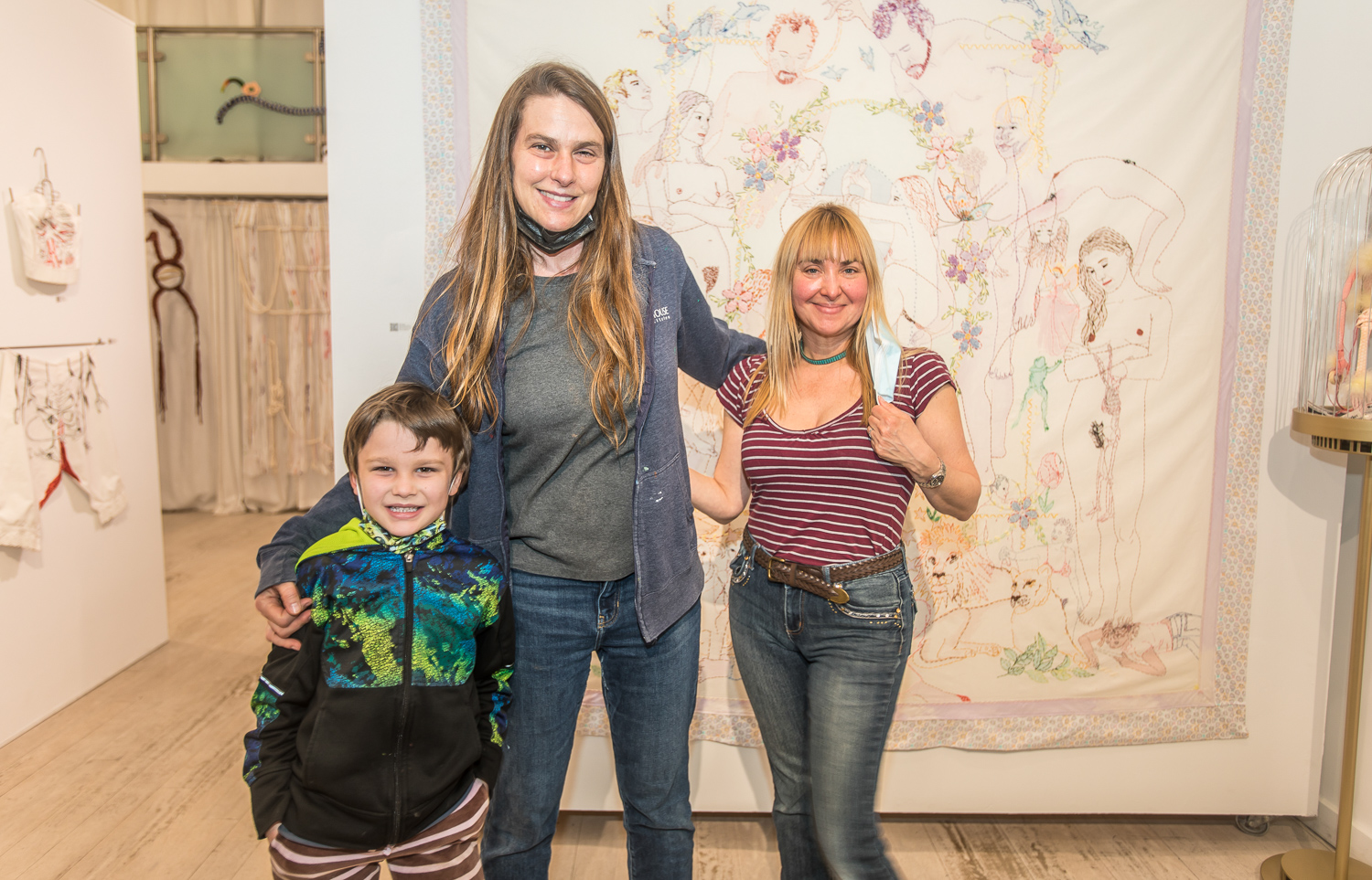 Indira Cesarine with artwork by Elise Drake "UNRAVELED: Confronting The Fabric of Fiber Art" Group Show, The Untitled Space gallery, New York