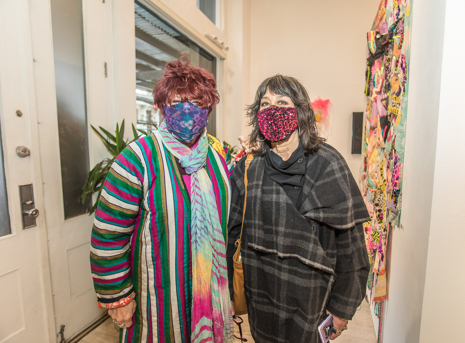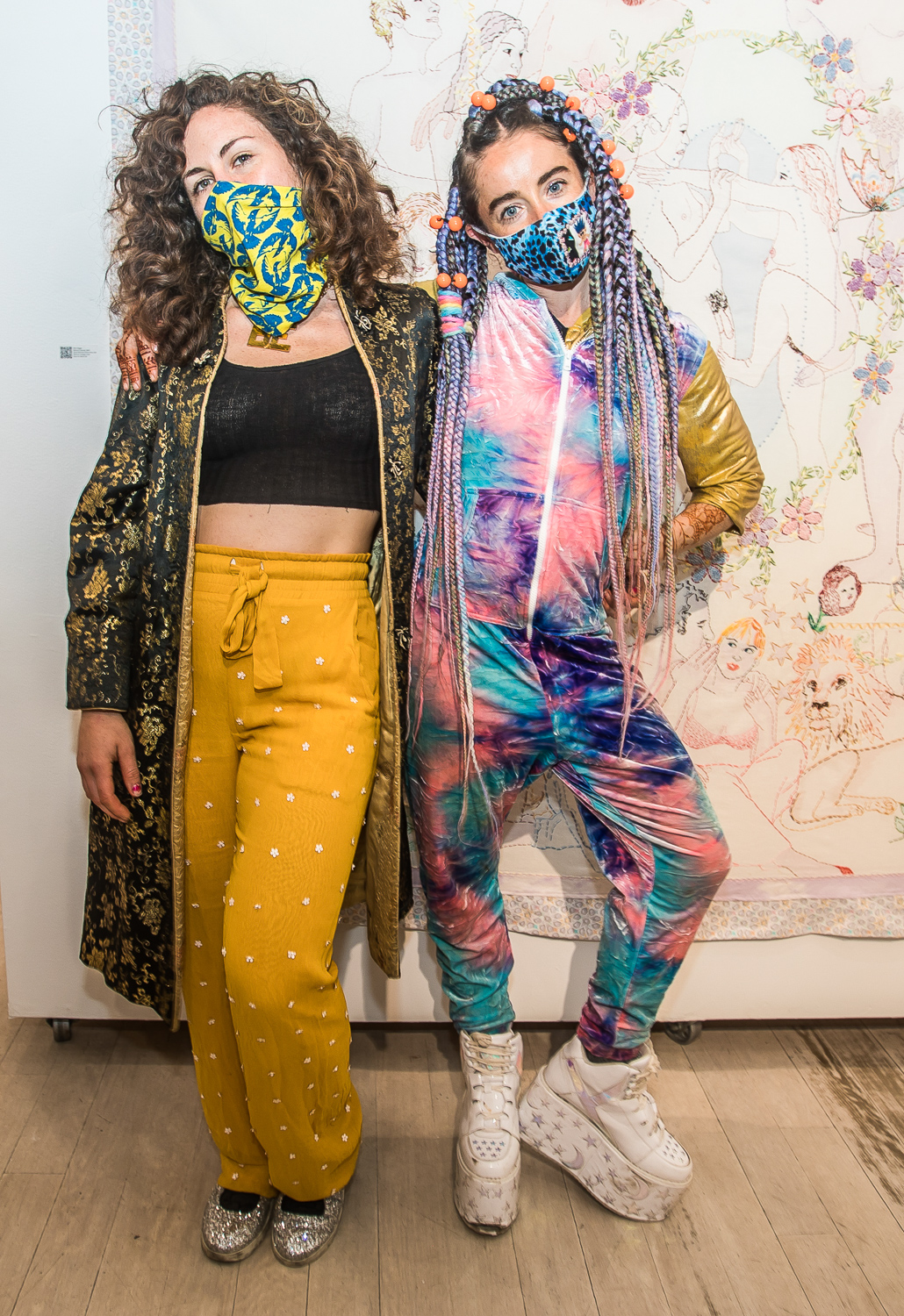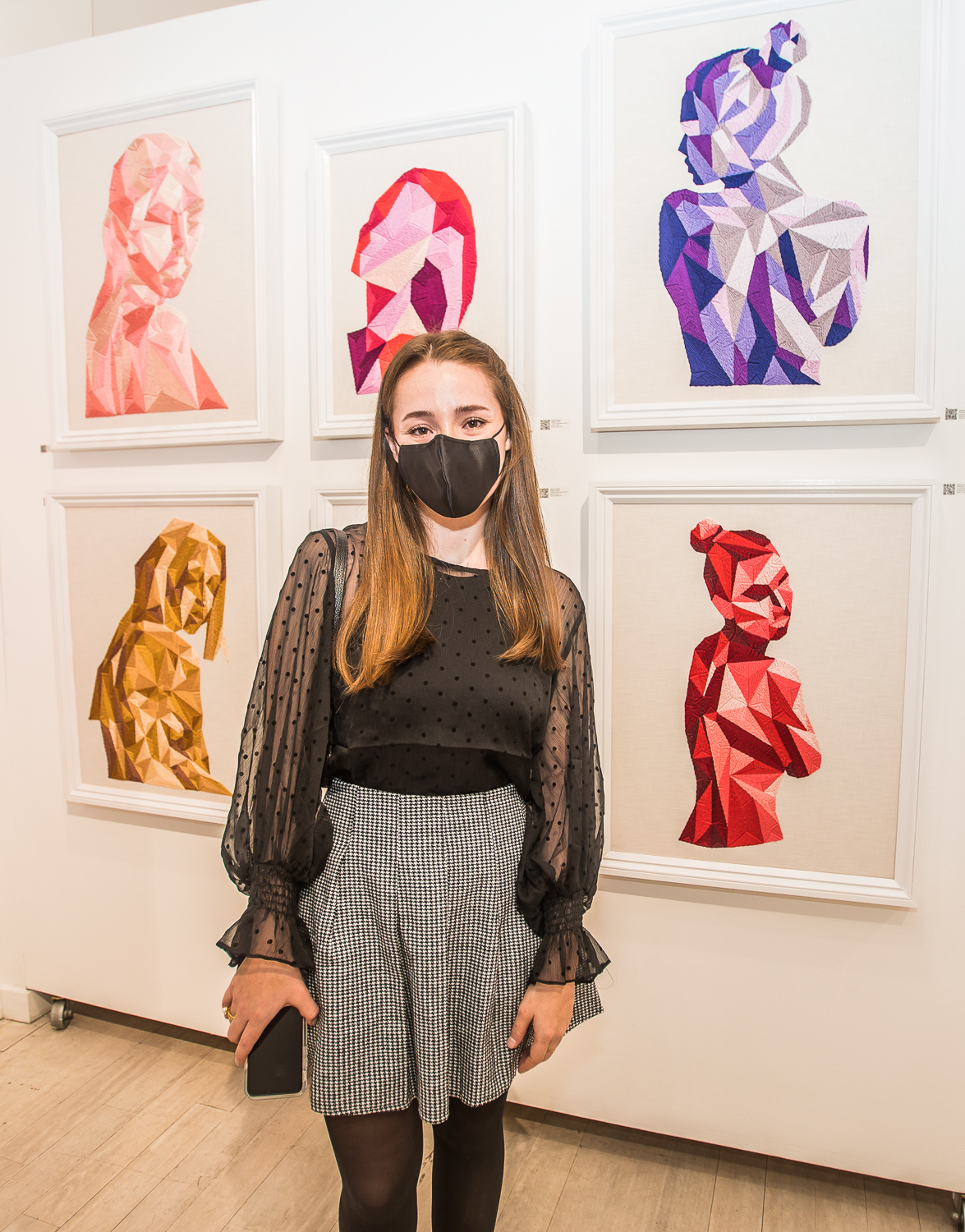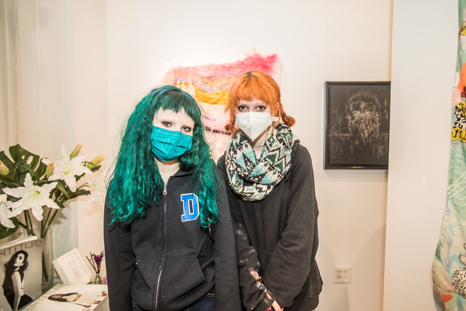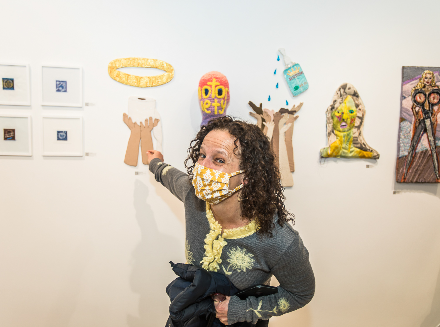 Indira Cesarine with artwork by Elise Drake "UNRAVELED: Confronting The Fabric of Fiber Art" Group Show, The Untitled Space gallery, New York
