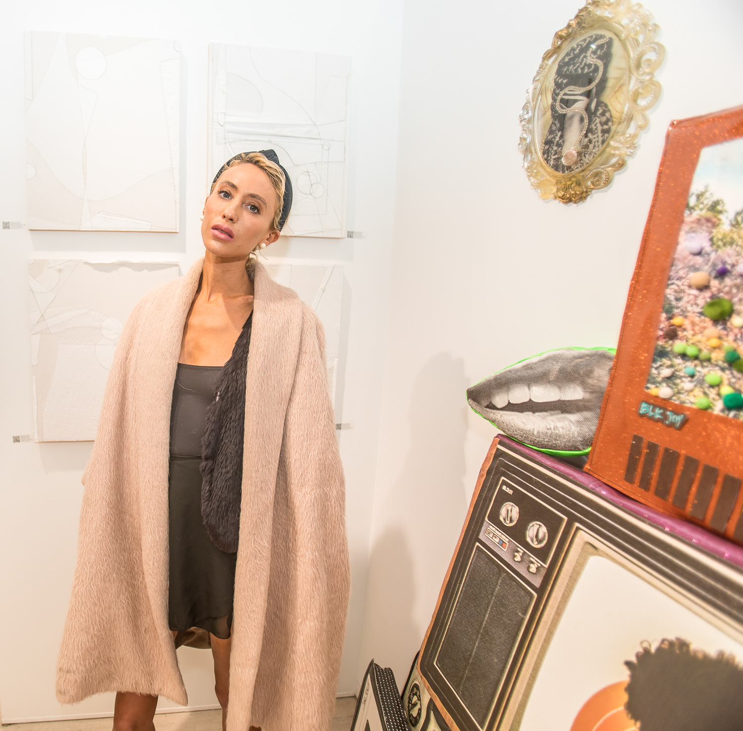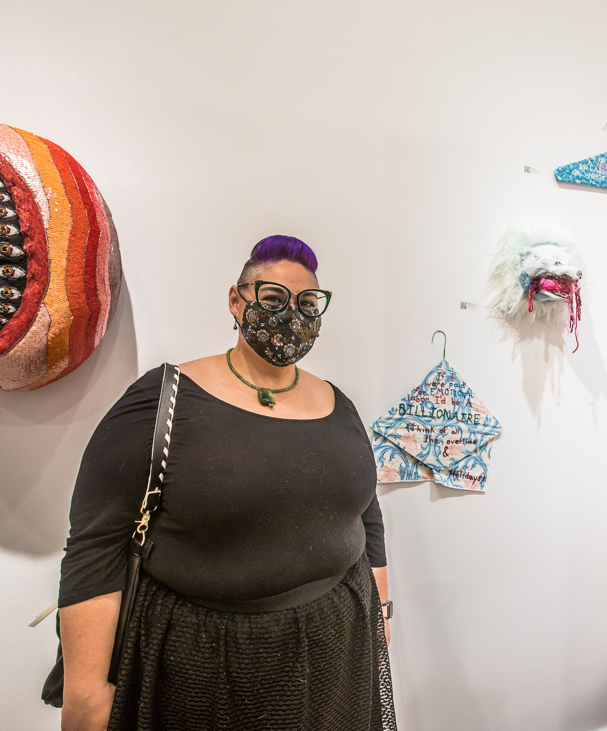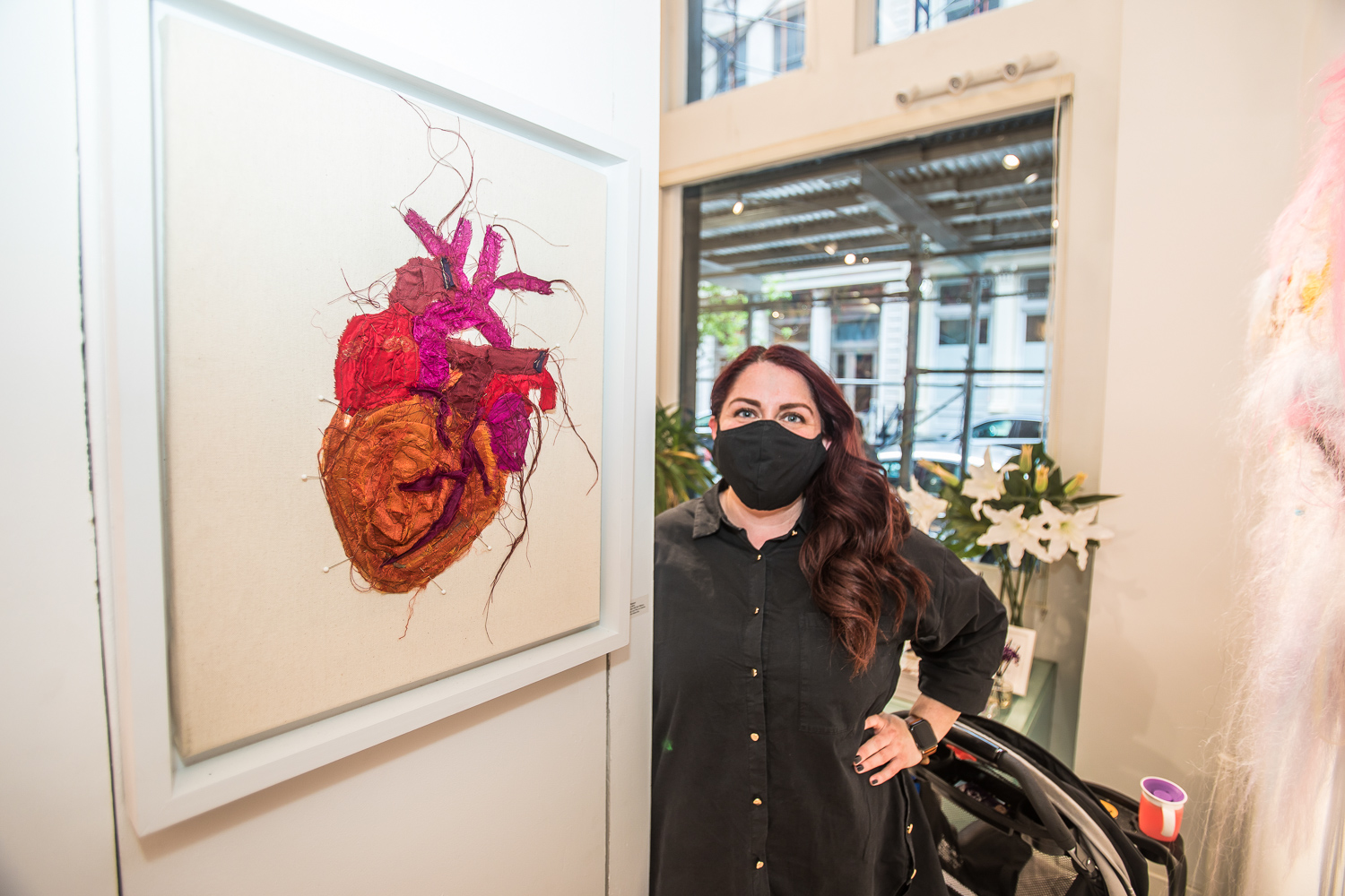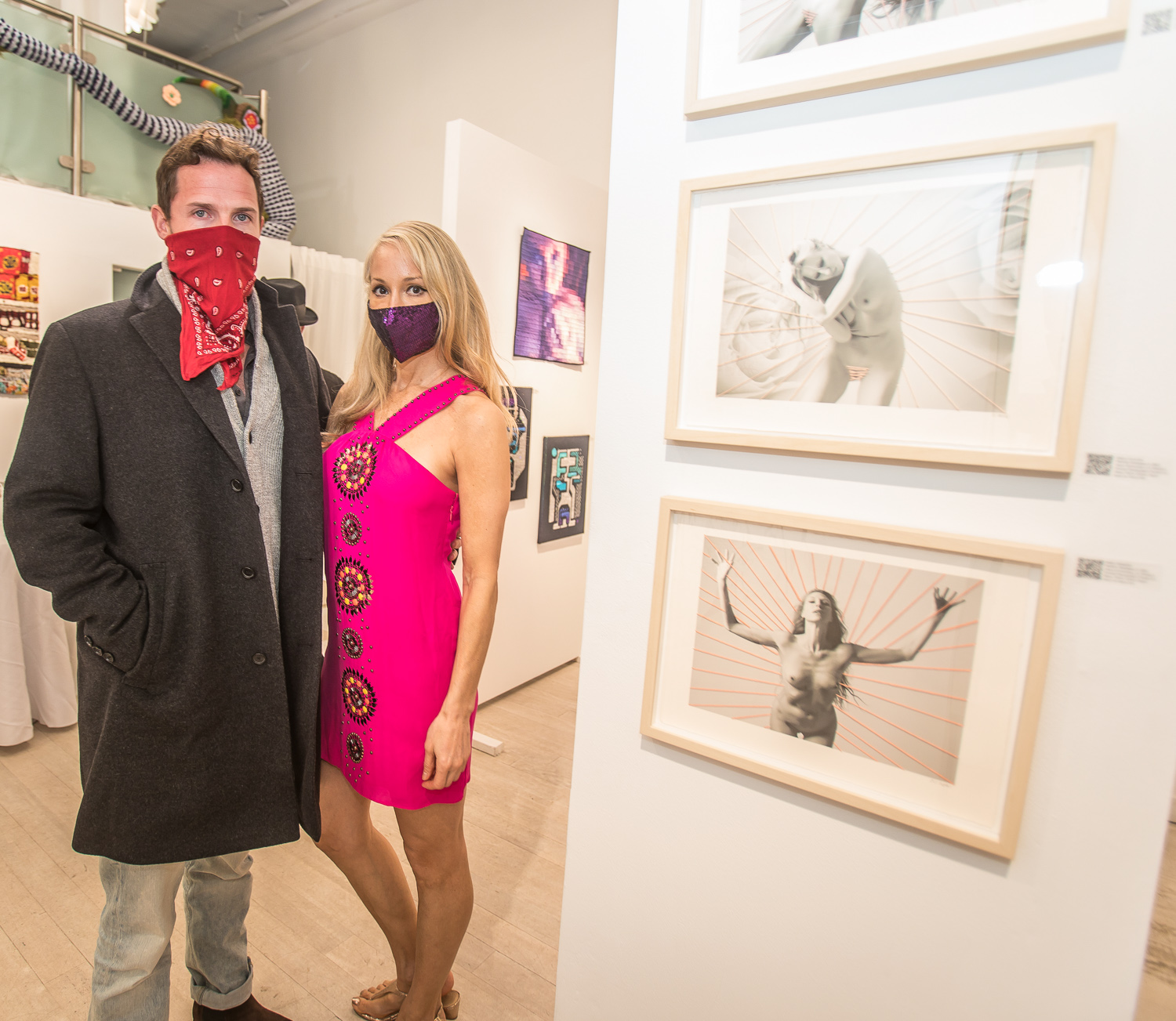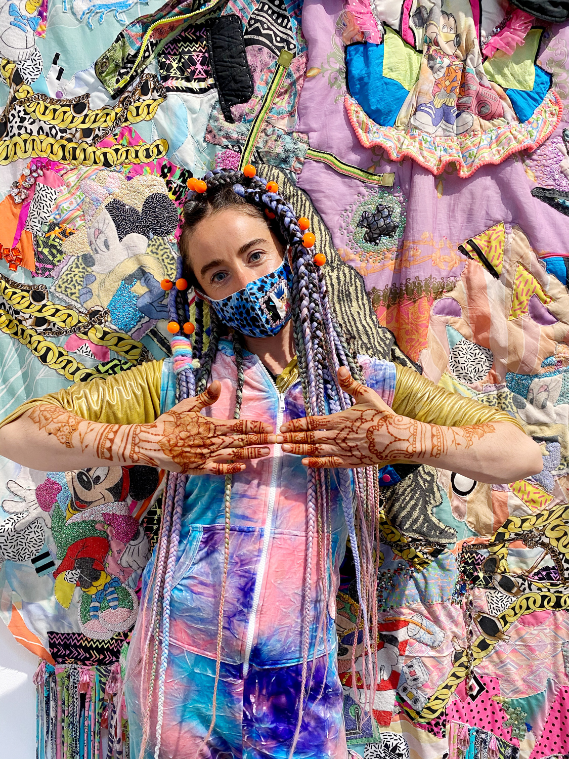 Indira Cesarine with artwork by Elise Drake "UNRAVELED: Confronting The Fabric of Fiber Art" Group Show, The Untitled Space gallery, New York