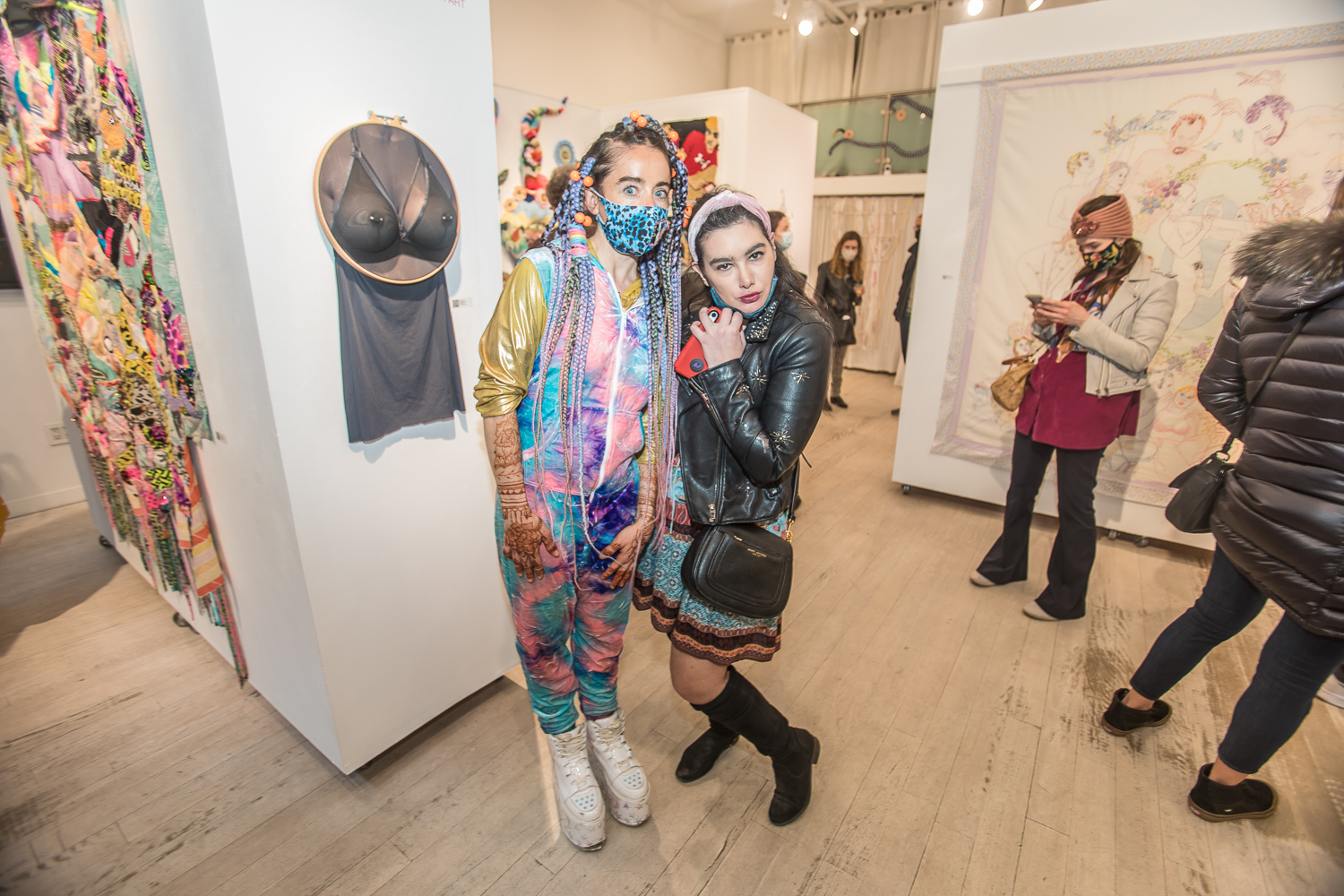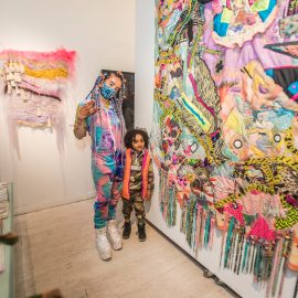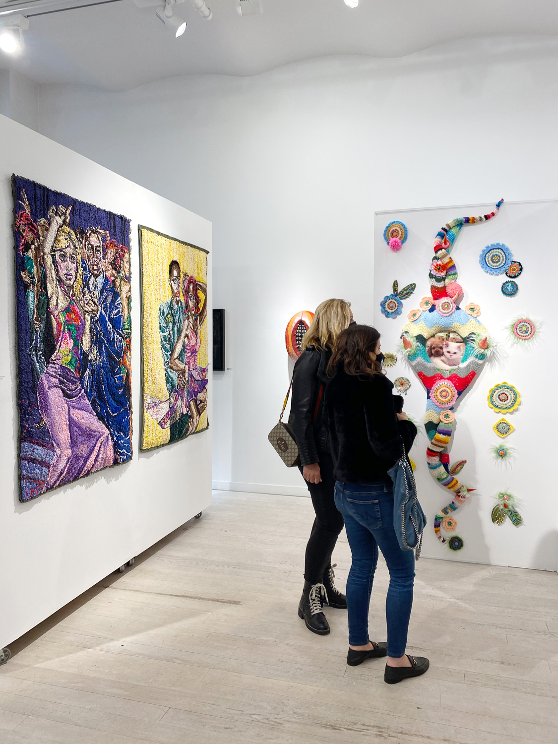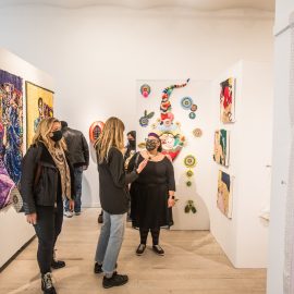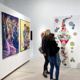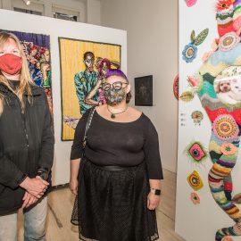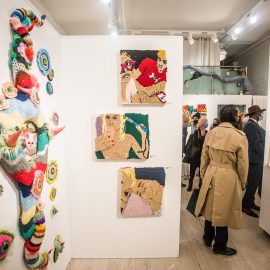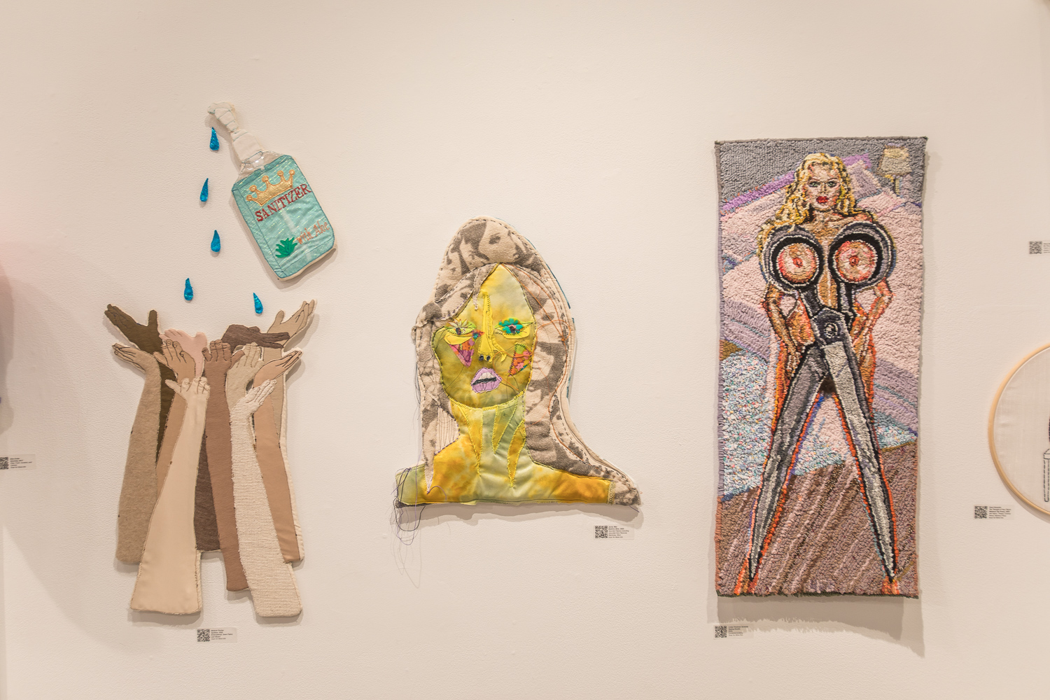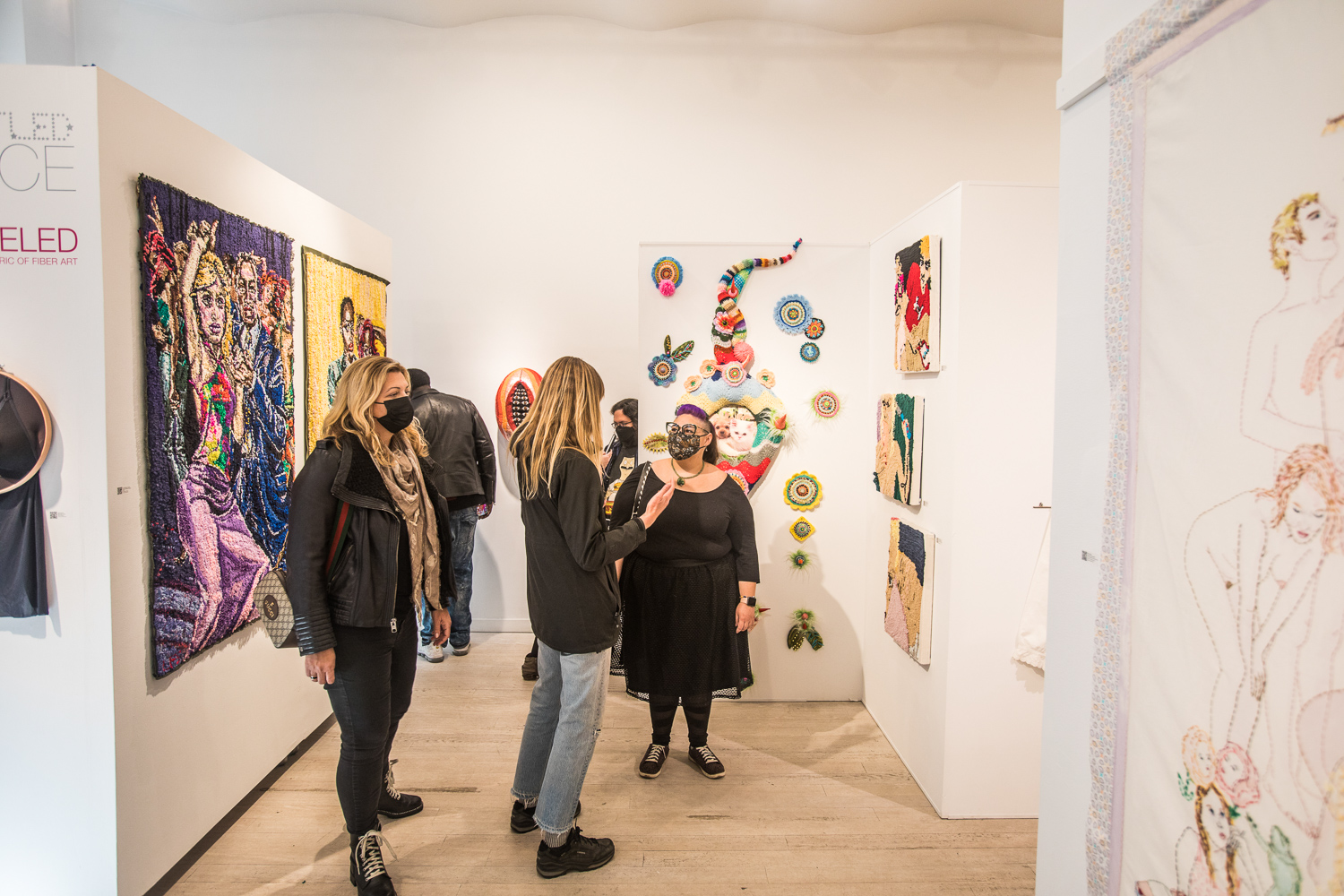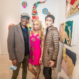 On April 17th, The Untitled Space celebrated the opening of their latest group show “UNRAVELED: Confronting The Fabric Of Fiber Art” with a reception at the gallery in Tribeca, NY from 1-8 pm. Artists and guests were able to enjoy viewing in person the exhibition of over 40 artists who work in textile and fiber-based mediums. The show explores in depth the themes and techniques of fiber art through the works of female-identifying artists working with natural and synthetic fiber, fabric, and yarn. Figurative and abstract works that address our lived experience and history through the lens of women weaving, knotting, twining, plaiting, coiling, pleating, lashing, and interlacing are juxtaposed throughout the gallery. Narratives of self-identification, race, religion, gender, sexuality, our shared experience, as well as protest and the patriarchy are literally “unraveled” through embroidery, felt, woven and hooked rugs, braided and sewn hair, sewn fabrics, discarded clothing, cross-stitching, repurposed materials and more.