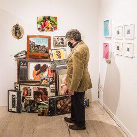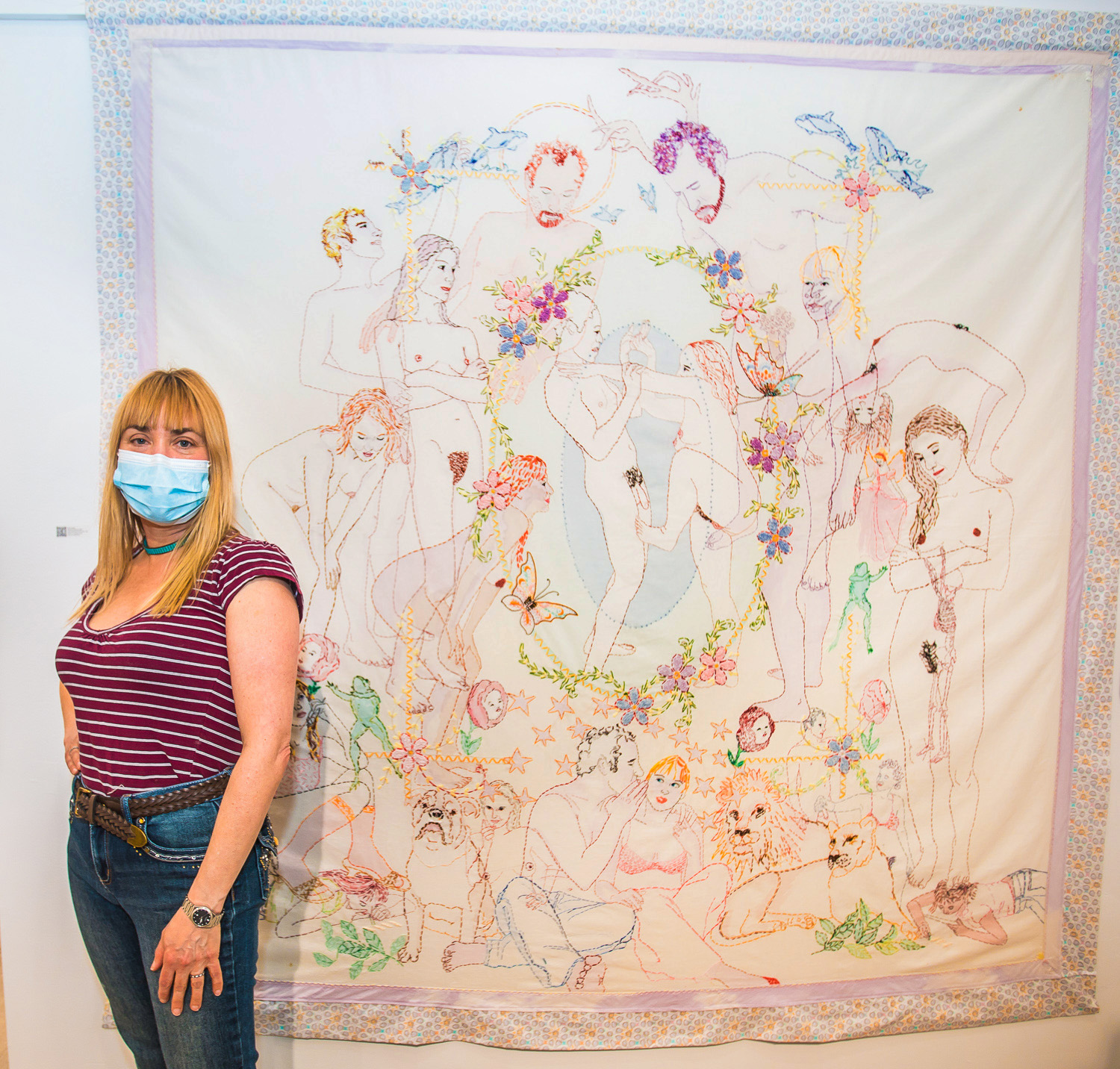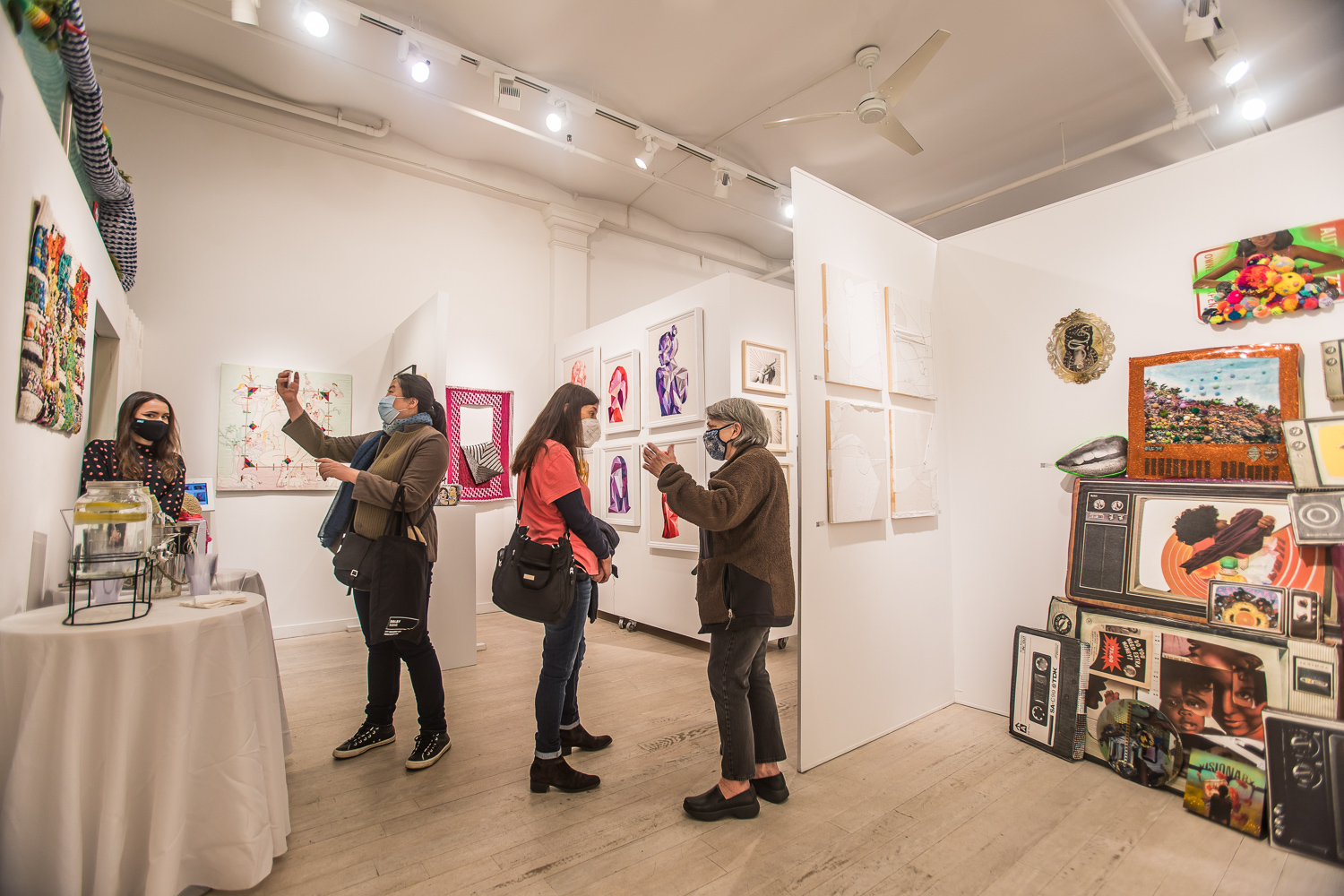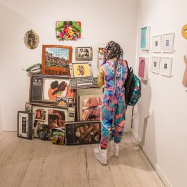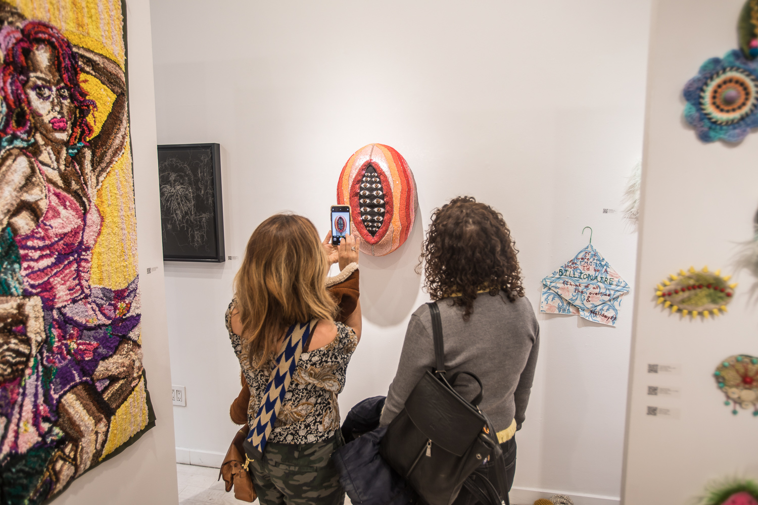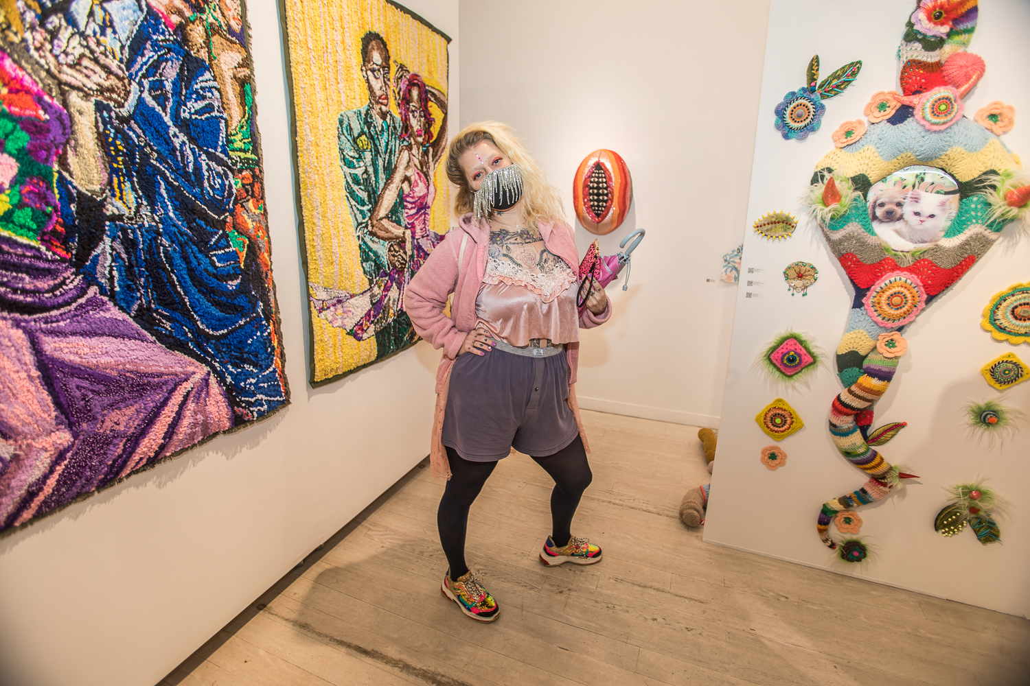 On April 17th, The Untitled Space celebrated the opening of their latest group show “UNRAVELED: Confronting The Fabric Of Fiber Art” with a reception at the gallery in Tribeca, NY from 1-8 pm. Artists and guests were able to enjoy viewing in person the exhibition of over 40 artists who work in textile and fiber-based mediums. The show explores in depth the themes and techniques of fiber art through the works of female-identifying artists working with natural and synthetic fiber, fabric, and yarn. Figurative and abstract works that address our lived experience and history through the lens of women weaving, knotting, twining, plaiting, coiling, pleating, lashing, and interlacing are juxtaposed throughout the gallery. Narratives of self-identification, race, religion, gender, sexuality, our shared experience, as well as protest and the patriarchy are literally “unraveled” through embroidery, felt, woven and hooked rugs, braided and sewn hair, sewn fabrics, discarded clothing, cross-stitching, repurposed materials and more.
