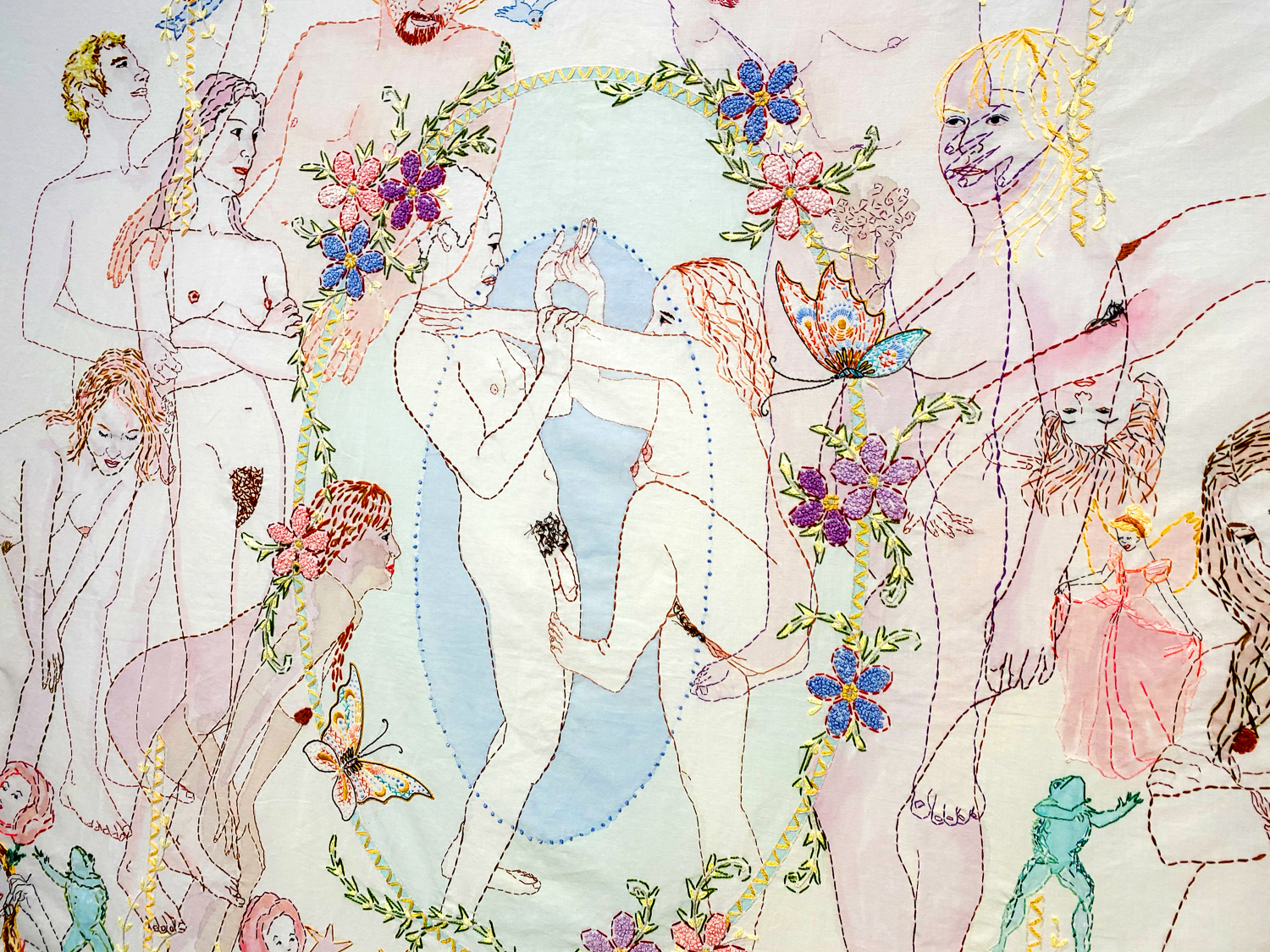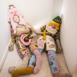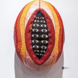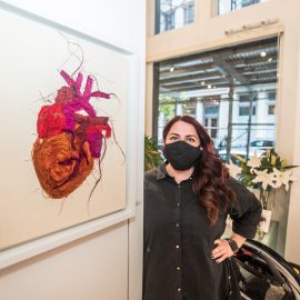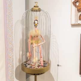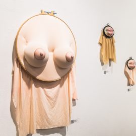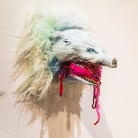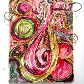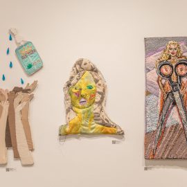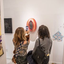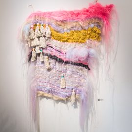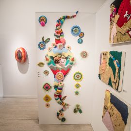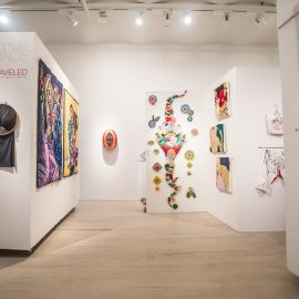 “UNRAVELED: Confronting the Fabric of Fiber Art explores the new wave of female-identifying artists who are using materials ranging from thread and yarn to human hair, fabrics, and discarded clothing, among a range of other components to unravel the “language of thread” with works that provoke and interrogate. Whether drawn from a deeply personal narrative, or rooted in political motivation, each artist weaves, spins, sews, and hooks the viewer with their detailed and intricate textures that communicate and empower. The exhibition presents two and three-dimensional pieces that explore with gravity and humor our contemporary culture, its beauty, flaws, and idiosyncrasies through murals, assemblages, fragile and gestural threads, meditative, and metaphorical fibers. UNRAVELED: Confronting the Fabric of Fiber Art pushes the boundaries, investigates ancient as well as new materials and techniques, and presents a contemporary universe of the language of women and their interwoven, progressive vocabulary.” – Curator Indira Cesarine