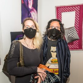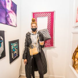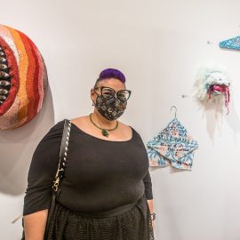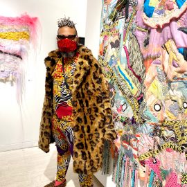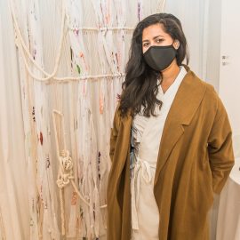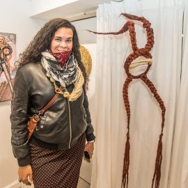 Curator Indira Cesarine at the opening reception for “UNRAVELED: Confronting The Fabric of Fiber Art” Group Show, The Untitled Space gallery, New York